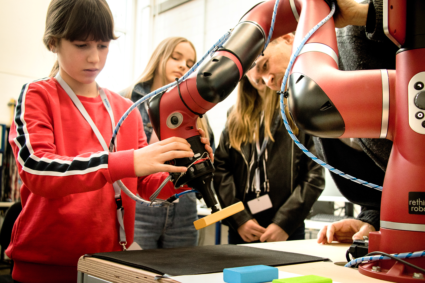 Im TH-Labor wartete Sawyer auf die Schülerinnen. Der Roboter, der an der Hochschule zu Schulungen dient, wird sonst in der Industrie eingesetzt, um Produkte im Akkord zu fertigen. Am Girls‘ Day machte Professor Christian Baier-Welt die Mädchen mit Sawyer vertraut. Die Schülerinnen führten mit dem Roboterarm Bewegungen aus und programmierten diese per Knopfdruck. Sawyer spielte die gelernten Bewegungen danach selbst ab und baute so ein Haus aus Bauklötzen auf. „Ich interessiere mich für Technik und wollte wissen, wie ein Roboter funktioniert. Daher habe ich mich für den Kurs angemeldet“, erklärte Teilnehmerin Jasmina von der Integrierten Gesamtschule in Stromberg.