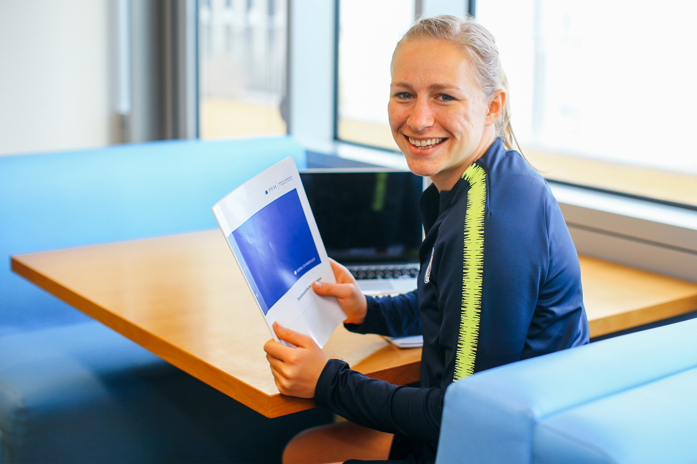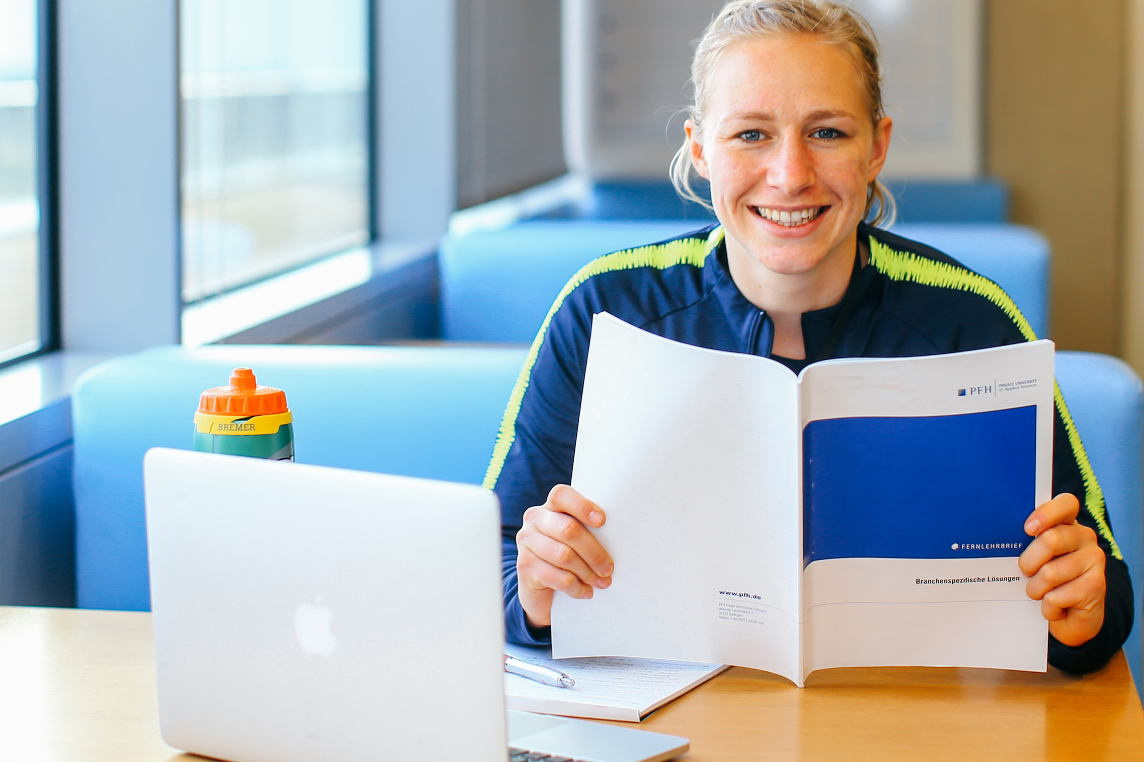 Gab die Verletzungspause auch Gelegenheit, an das Leben nach dem Sport zu denken und sich zum Beispiel verstärkt dem nebenberuflichen Studium zu widmen? "Nein und ja", meint Bremer. "Meine Einheiten im Reha-Zentrum dauerten meist sogar länger als das Teamtraining auf dem Platz. Andererseits bekommt der Alltag mehr Regelmäßigkeit, wenn die Reisen zu Auswärtsspielen & Co. entfallen. So hatte ich zwar nicht mehr freie Zeit als sonst, aber es fiel mir leichter, feste Lernzeiten einzurichten", führt Bremer aus. Doch mit ihrem BWL-Fernstudium kommt die Stürmerin ohnehin recht gut voran. Sie ist bereits seit drei Jahren an der PFH eingeschrieben und Stipendiatin im Leistungssportprogramm der Hochschule. So rüstet sie sich für die Karriere nach der Karriere.