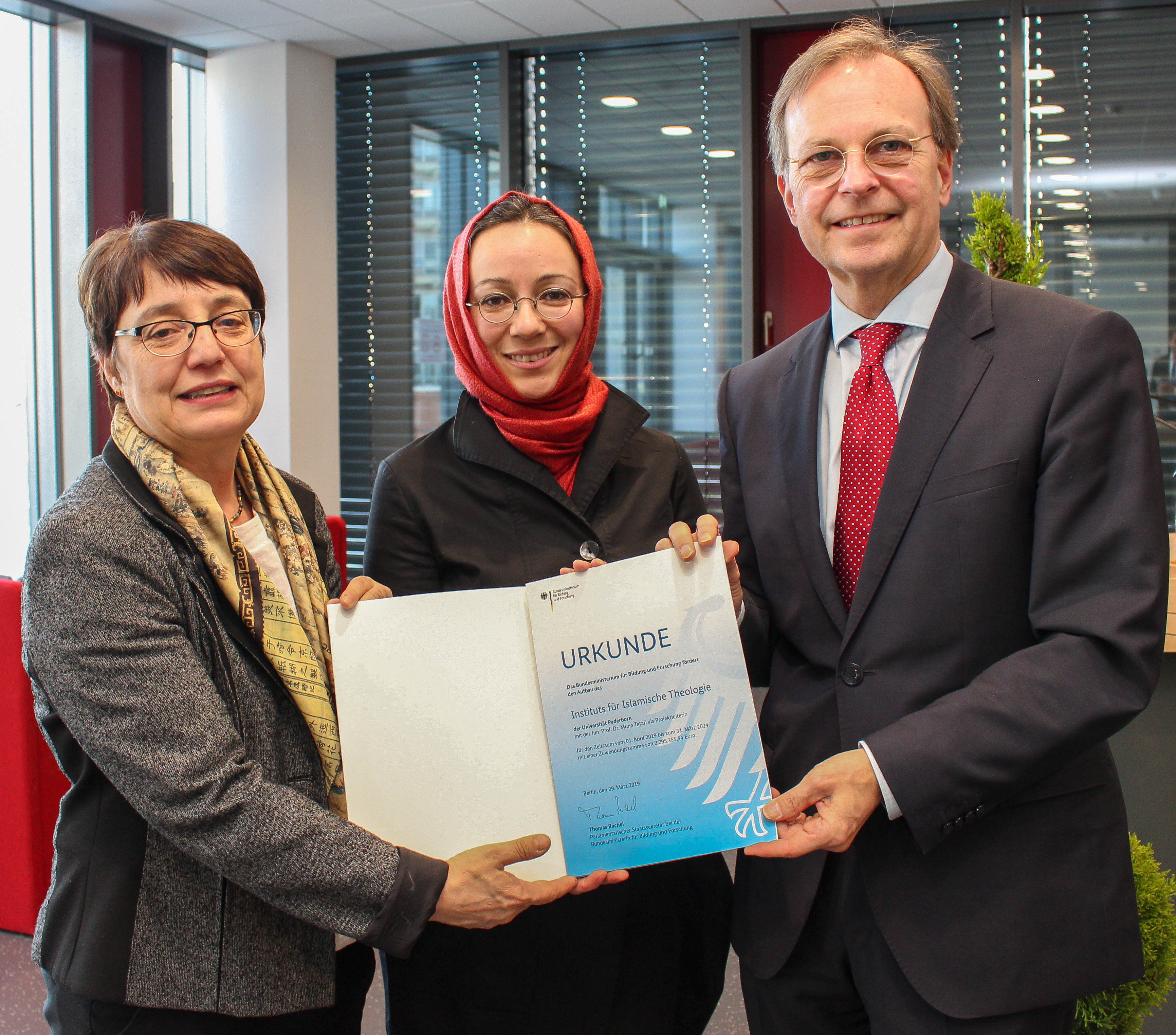 Am Freitag, 29. März, übergab Thomas Rachel MdB, Parlamentarischer Staatssekretär im Bundesministerium für Bildung und Forschung, den offiziellen Zuwendungsbescheid über 2,3 Millionen Euro zum Aufbau des Instituts für Islamische Theologie an der Fakultät für Kulturwissenschaften an die Präsidentin der Universität Paderborn, Prof. Dr. Birgitt Riegraf. Das Institut soll einerseits Forschungsarbeit aus muslimischer Sicht im Bereich der Koranexegese – also der Interpretation des Korans –, der systematischen Theologie, der Normenlehre und der Religionspädagogik leisten. Andererseits sollen Studiengänge für die Ausbildung von Lehramtsstudierenden entwickelt werden. Dabei wird die enge Verzahnung der islamischen Theologien mit den christlichen Theologien und den jüdischen Studien, aber auch mit allen anderen Fächern der Fakultät für Kulturwissenschaften ein besonders Kennzeichen des neuen Standorts sein. Der Studiengang wird dabei auf viele Jahre der intensiven interdisziplinären Zusammenarbeit über Religionsgrenzen hinweg am Zentrum für Komparative Theologie und Kulturwissenschaften aufbauen können.