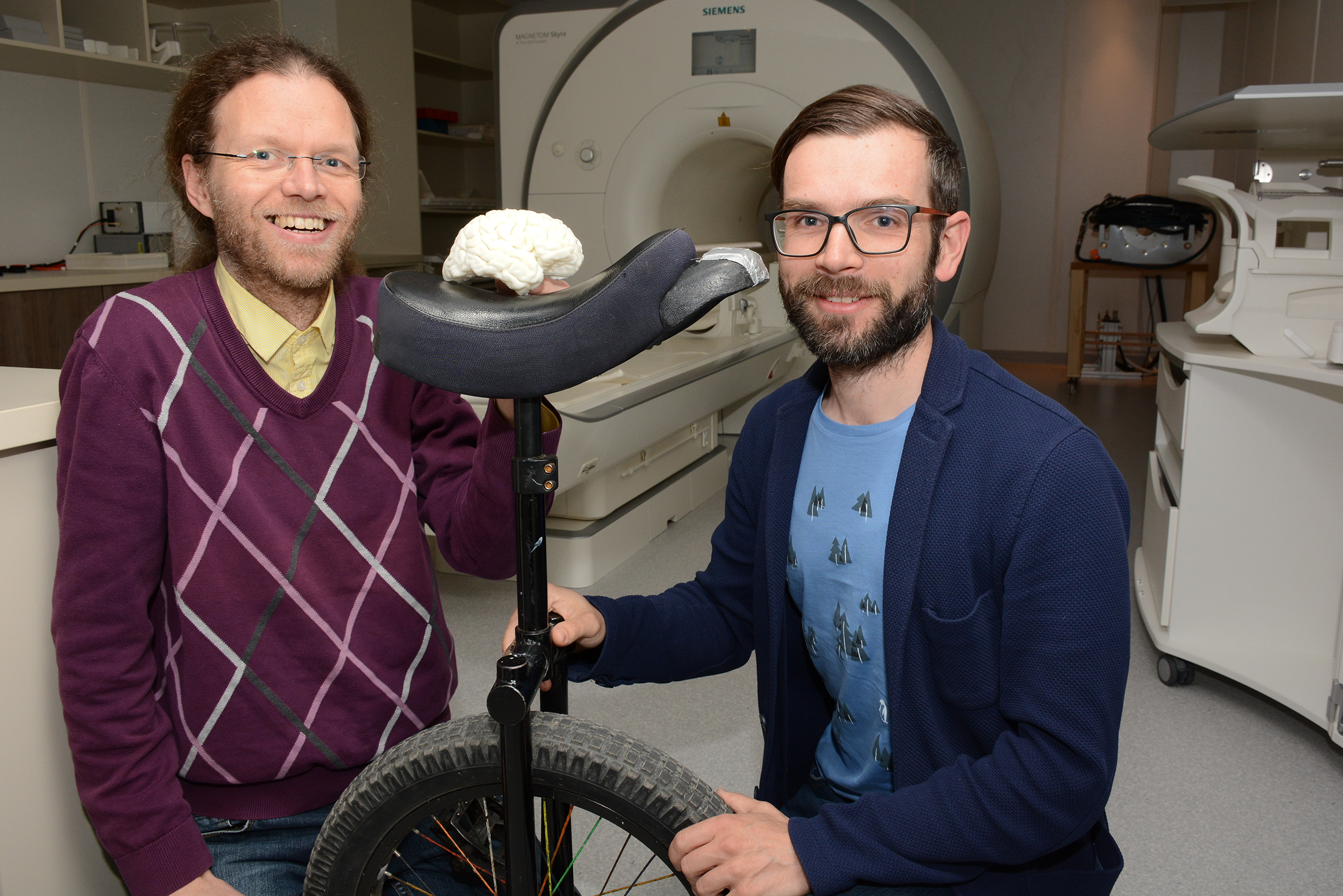 „Am Einrad geht’s rund, und dabei auch im Kopf“, sagt Bernhard Weber. Einradfahren zählt wohl zu den größten Herausforderungen für den Gleichgewichtssinn. Kinder lernen das in rund einer Woche. Überrascht waren der Doktorand Bernhard Weber und Senior Scientist Karl Koschutnig, dass die erwachsenen TeilnehmerInnen der Studie das mindestens ebenso rasch schafften. Im Gehirn der 23 Personen tat sich dabei Bemerkenswertes. Die Psychologen stellten signifikante Veränderungen in der grauen und der weißen Masse sowie in der Dicke der Großhirnrinde fest.