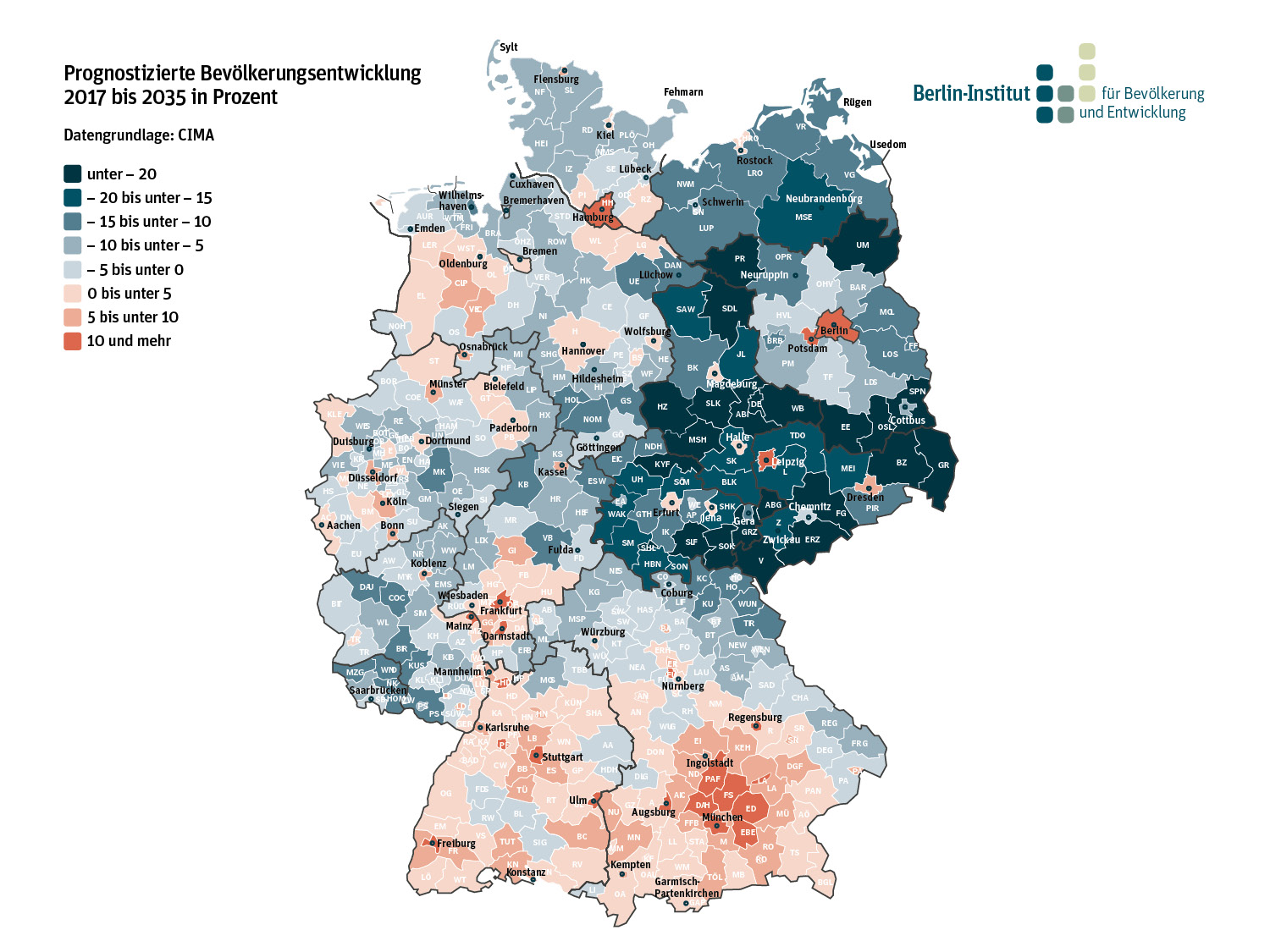 In allen fünf ostdeutschen Flächenländern werden der Prognose zufolge die Bevölkerungszahlen bis 2035 zurückgehen – am stärksten mit fast 16 Prozent in Sachsen-Anhalt. Weite Regionen zwischen Rügen und dem Erzgebirge werden mehr als jeden fünften Einwohner verlieren. Die Alterung der Gesellschaft führt dazu, dass im brandenburgischen Landkreis Spree-Neiße 2035 auf eine Geburt vier Beerdigungen kommen dürften. Gleichzeitig liegt im Osten aber auch die am schnellsten wachsende Stadt der Republik: Leipzig muss bis 2035 ein weiteres Einwohnerplus von rund 16 Prozent verkraften. Zu den wenigen weiteren Leuchttürmen in den fünf ostdeutschen Flächenländern zählen Potsdam, Dresden, Erfurt, Jena, Rostock, Halle und Magdeburg.