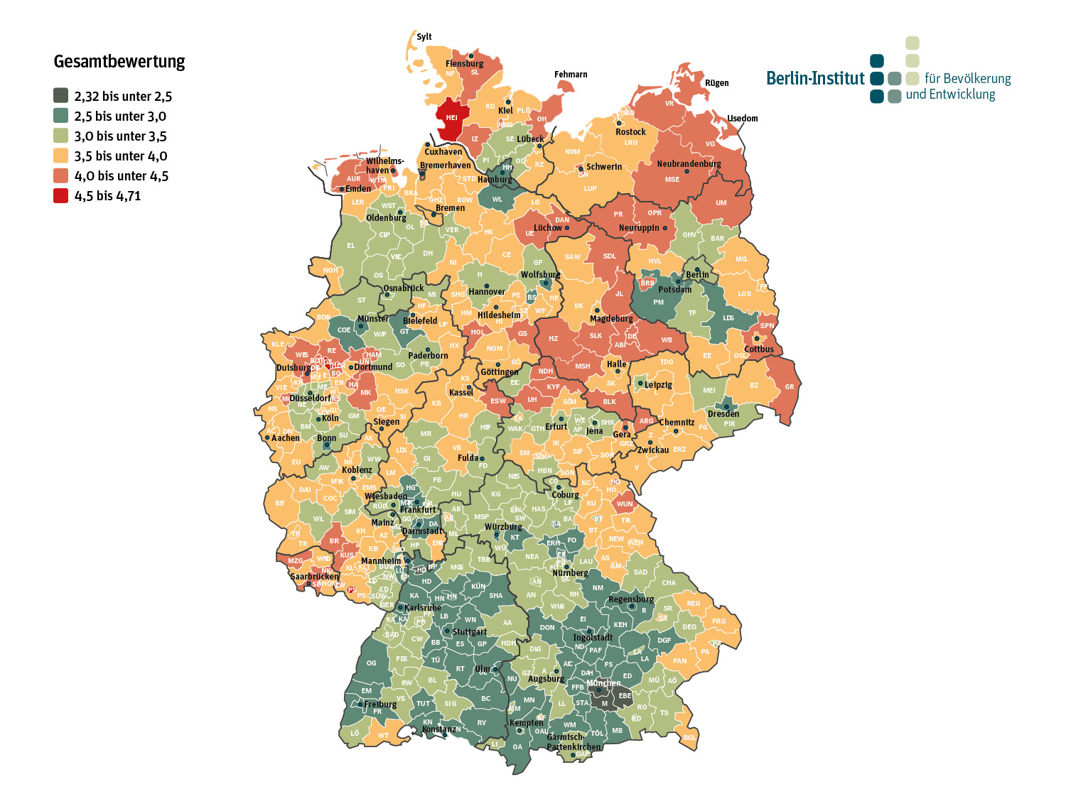 Um die „Zukunftsfähigkeit“ der Regionen vergleichbar zu bewerten, hat das Berlin-Institut 21 Indikatoren ausgewählt – aus den Bereichen Demografie, Wirtschaft, Bildung und Familienfreundlichkeit. „Die Politik wünscht sich zwar eine „Gleichwertigkeit der Lebensverhältnisse“, doch die Realität zeigt, dass wir es eher mit einer Vielfalt der Lebensbedingungen zu tun haben,“ sagt Reiner Klingholz. Das zeigt sich auch in den Gesamtnoten des Index, die von 2,32 für die bayerische Landeshauptstadt München bis 4,71 für die Ruhrgebietsstadt Gelsenkirchen reichen.
