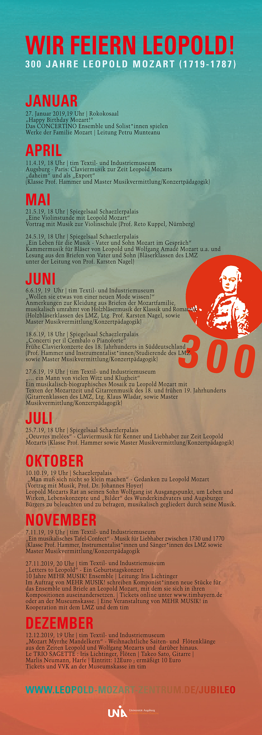 Während dessen ganzen Jubiläumsjahres beschäftigen sich Lehrende und Studierende des LMZ der Universität Augsburg mit Leopold Mozart und dessen Wirken im Kontext seiner Zeit. Bei einer Veranstaltung mit dem Titel „Augsburg – Paris: Claviermusik zur Zeit Leopold Mozarts ‚daheim’ und als ‚Export’“, die am11. April 2019 im Staatlichen Textil- und Industriemuseum Augsburg (tim) stattfindet, steht der internationale Austausch in der Musik des 18. Jahrhunderts thematisch im Vordergrund. Gespielt werden Werke von Komponistenkolleginnen und -kollegen Leopold Mozarts, die heute größtenteils in Vergessenheit geraten sind.