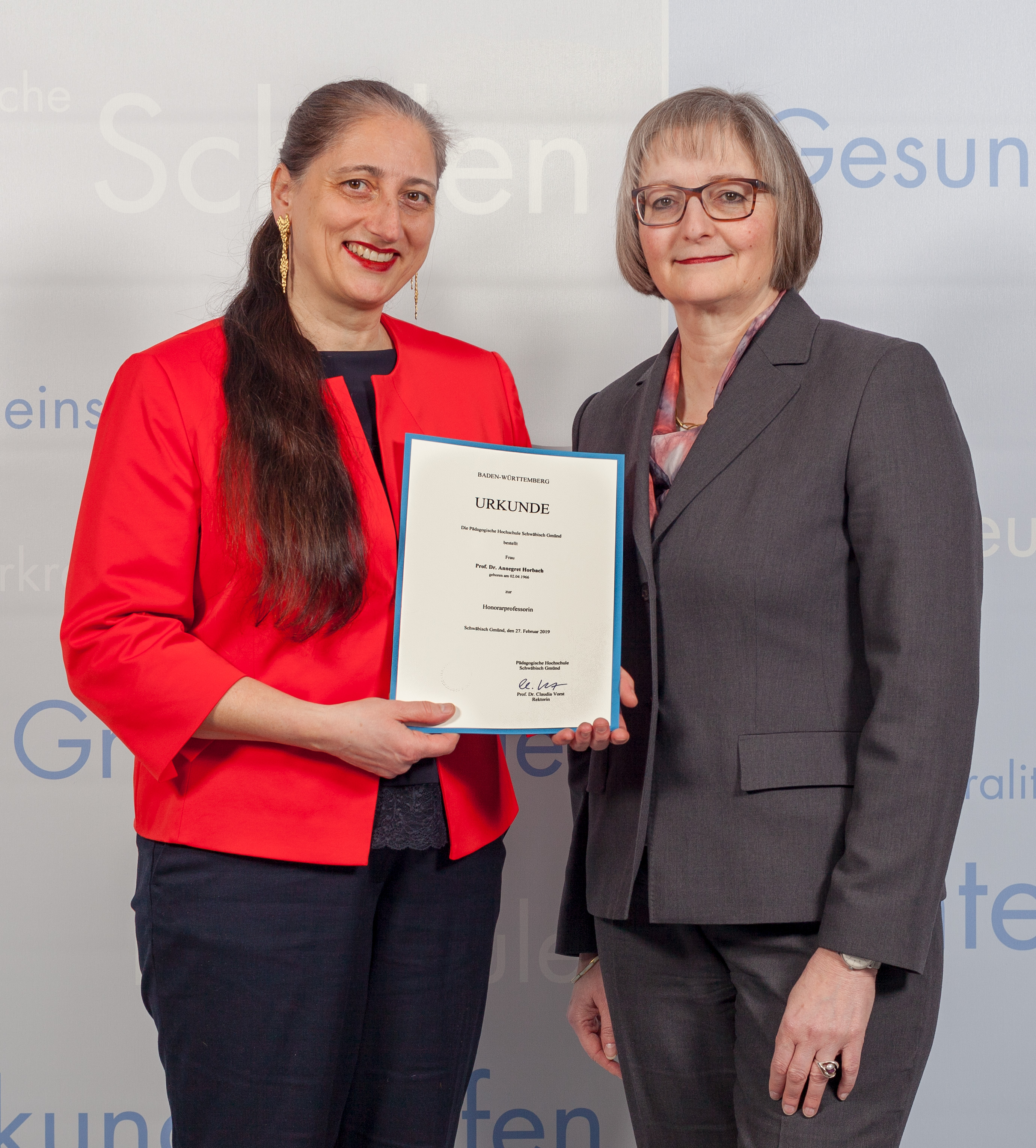 Prof. Dr. Annegret Horbach, seit 2008 Professorin für klinische Pflegewissenschaft und -forschung am Fachbereich Soziale Arbeit und Gesundheit der Frankfurt University of Applied Sciences (Frankfurt UAS), wurde zur Honorarprofessorin an der Pädagogischen Hochschule (PH) Schwäbisch Gmünd bestellt. PH-Rektorin Prof. Dr. Claudia Vorst überreichte im März 2019 die Urkunde an Horbach. Ihre Bestellung erfolgte in Anerkennung ihrer hervorragenden wissenschaftlichen Qualifikation und ihrer großen Verdienste um den Aufbau des Studienbereichs Pflegewissenschaft an der PH. Als Gründungs- und Vertretungsprofessorin legte Horbach gemeinsam mit Prof. Dr. Johann Behrens den Grundstein für den primärqualifizierenden Bachelor-Studiengang Pflegewissenschaft an der Gmünder PH, der im Wintersemester 2017/2018 startete.