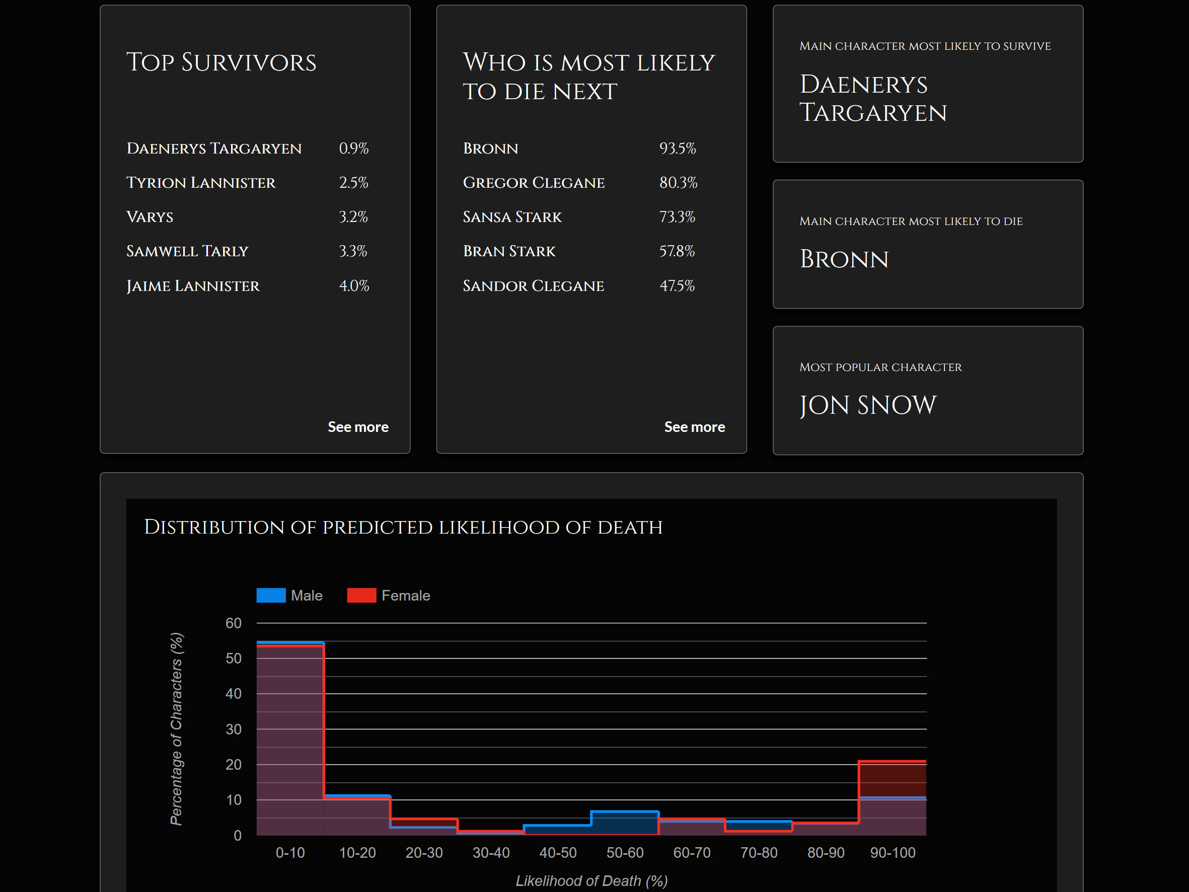 Die Überlebensraten werden mithilfe der Langlebigkeitsanalyse vorhergesagt. Diese Technik ähnelt wissenschaftlichen Anwendungen, bei denen die Auswirkungen von Behandlungen und Komplikationen bei Krebspatienten untersucht werden. Die vollständige Liste der Charaktere und ihre Überlebenschancen sind online unter https://got.show verfügbar.