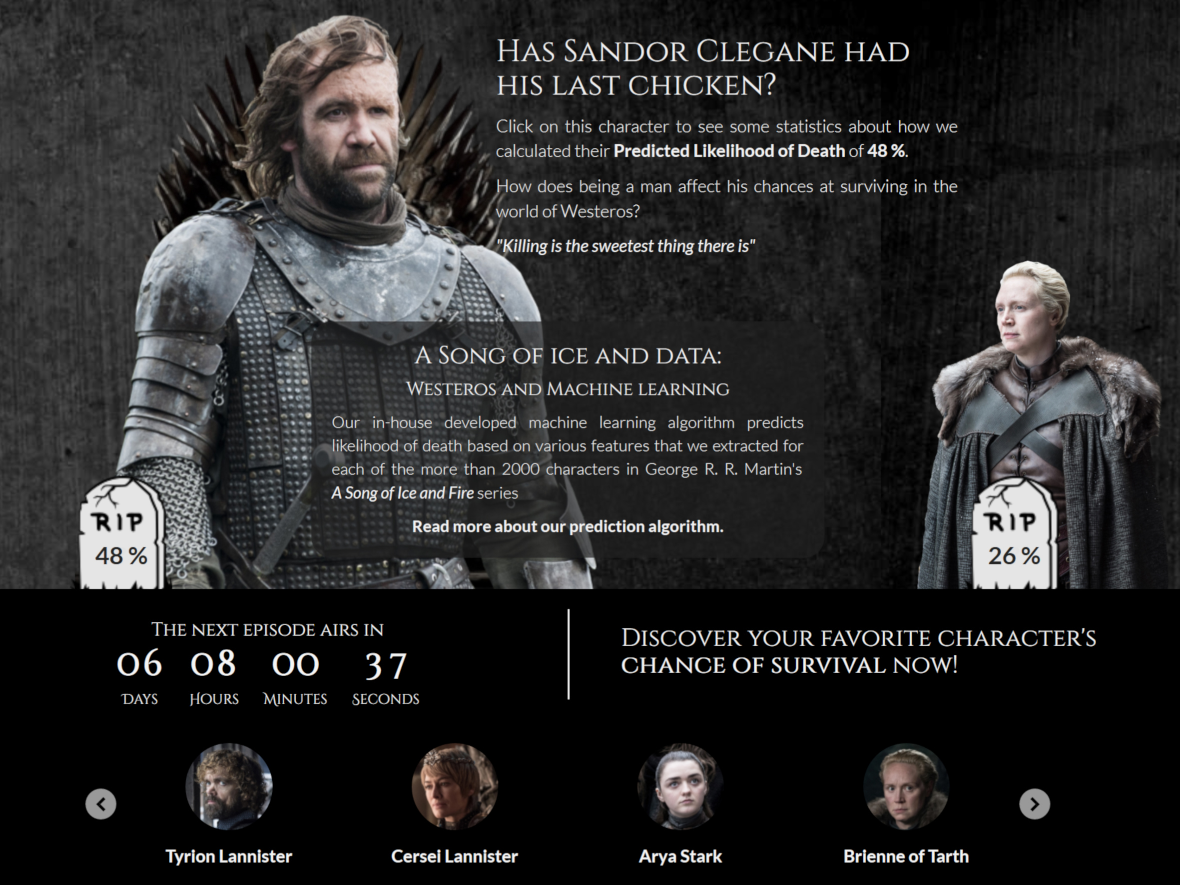 Savvy GoT fans can get an in-depth look into the main reasons for the algorithm’s predictions. For instance, being born in Winterfell to the House of Stark as well as only being married once seems to increase the chances of Sansa Stark to be eliminated in the upcoming season; her predicted likelihood of death is 73%.
