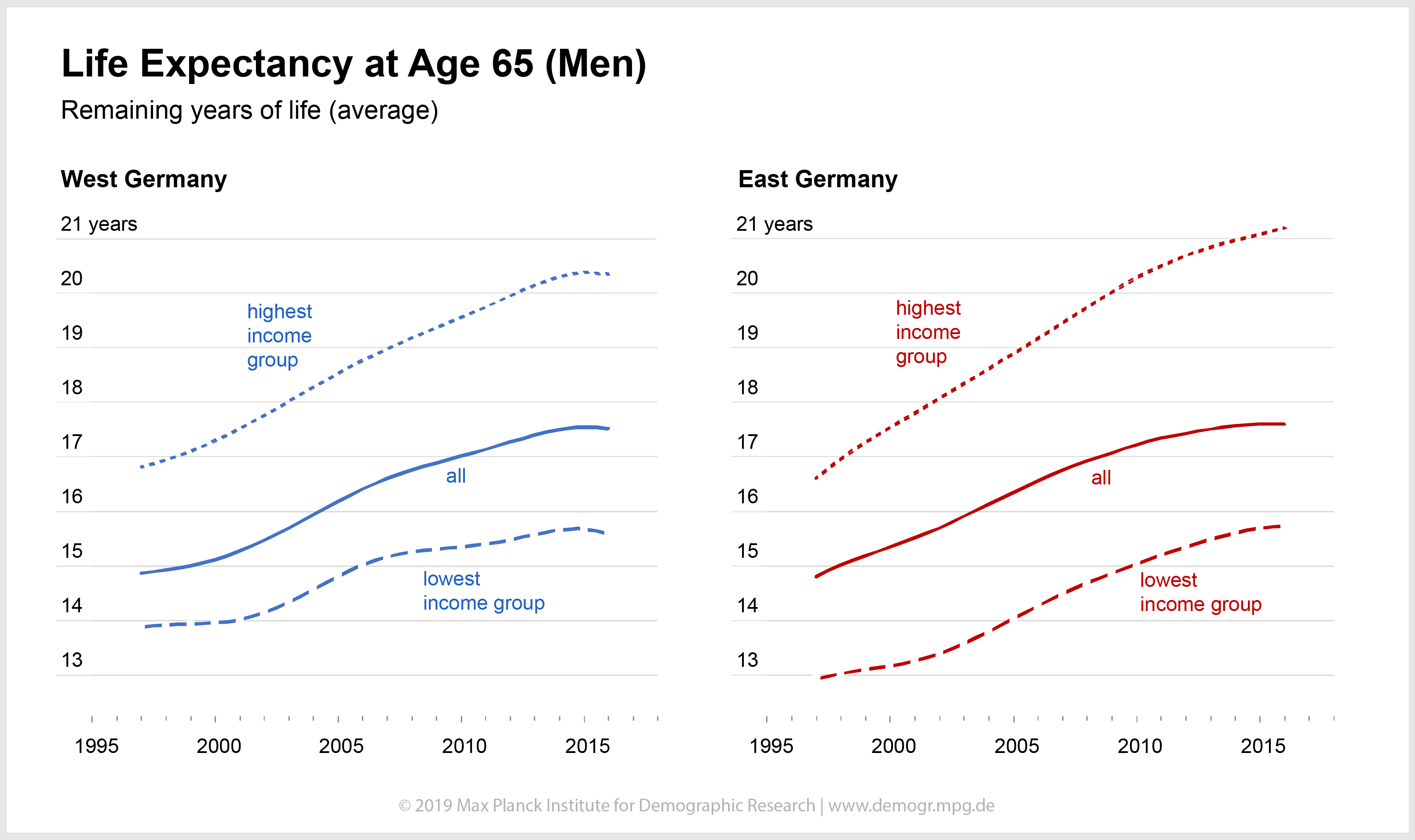 While life expectancy has been rising for all income levels, it increased by only 1.8 years in the lowest income group in West Germany from 1997 to 2016 and the highest income group gained almost twice as many years of life. During the same period in East Germany, gains for those in the highest benefit group were 4.7 years, versus the increase of only three years in the lowest group.