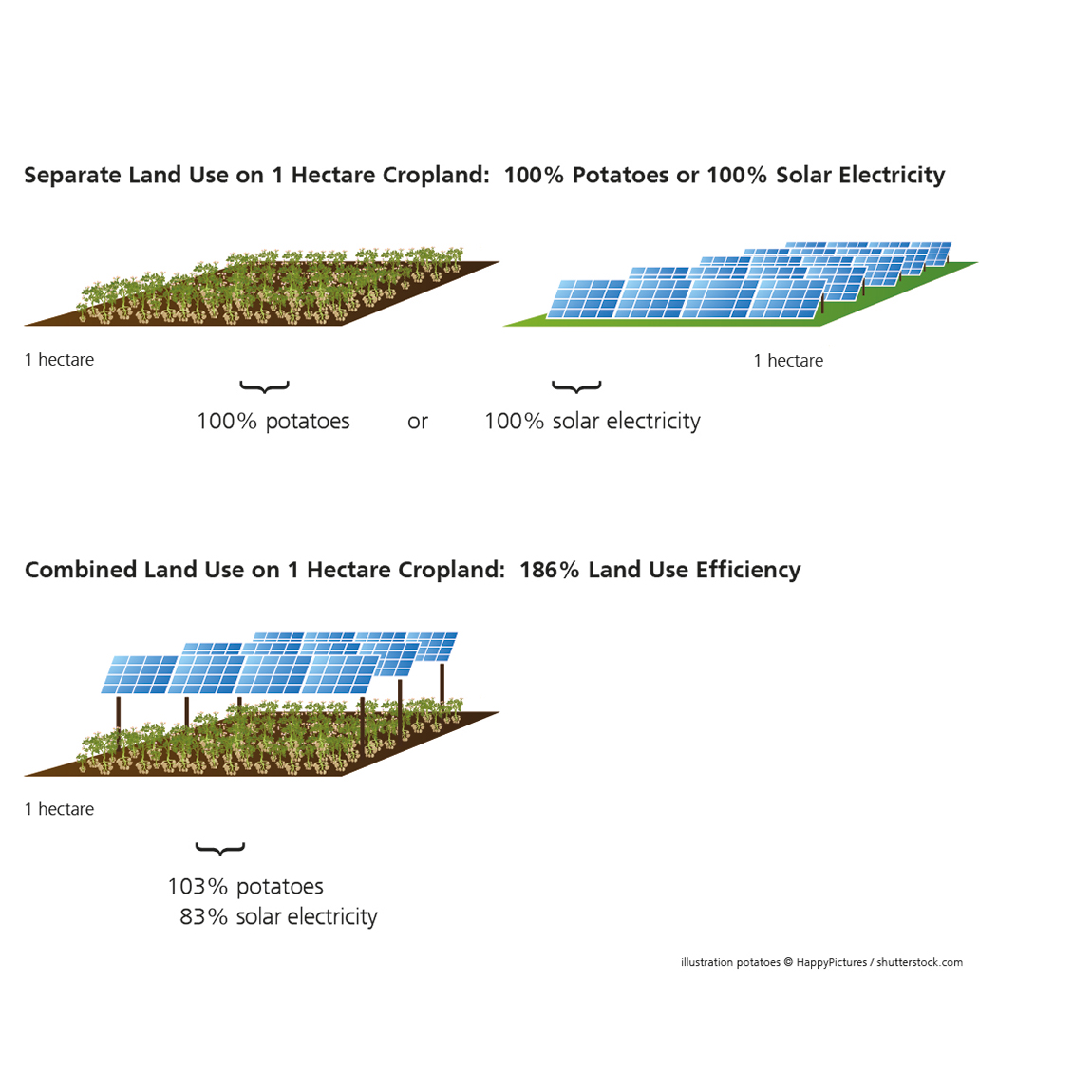 Over the past two years, the dual use of land for the harvesting of solar electricity and agriculture has been tested in the joint project “Agrophotovoltaics – Resource Efficient Land Use (APV-RESOLA).” On one-third of a hectare arable land near Lake Constance in Germany, photovoltaic modules with a total power output of 194 kilowatt are installed on a five meter high structure. The results from 2017 showed a land use efficiency of 160 percent, as confirmed by the project consortium under the direction of the Fraunhofer Institute for Solar Energy Systems ISE.