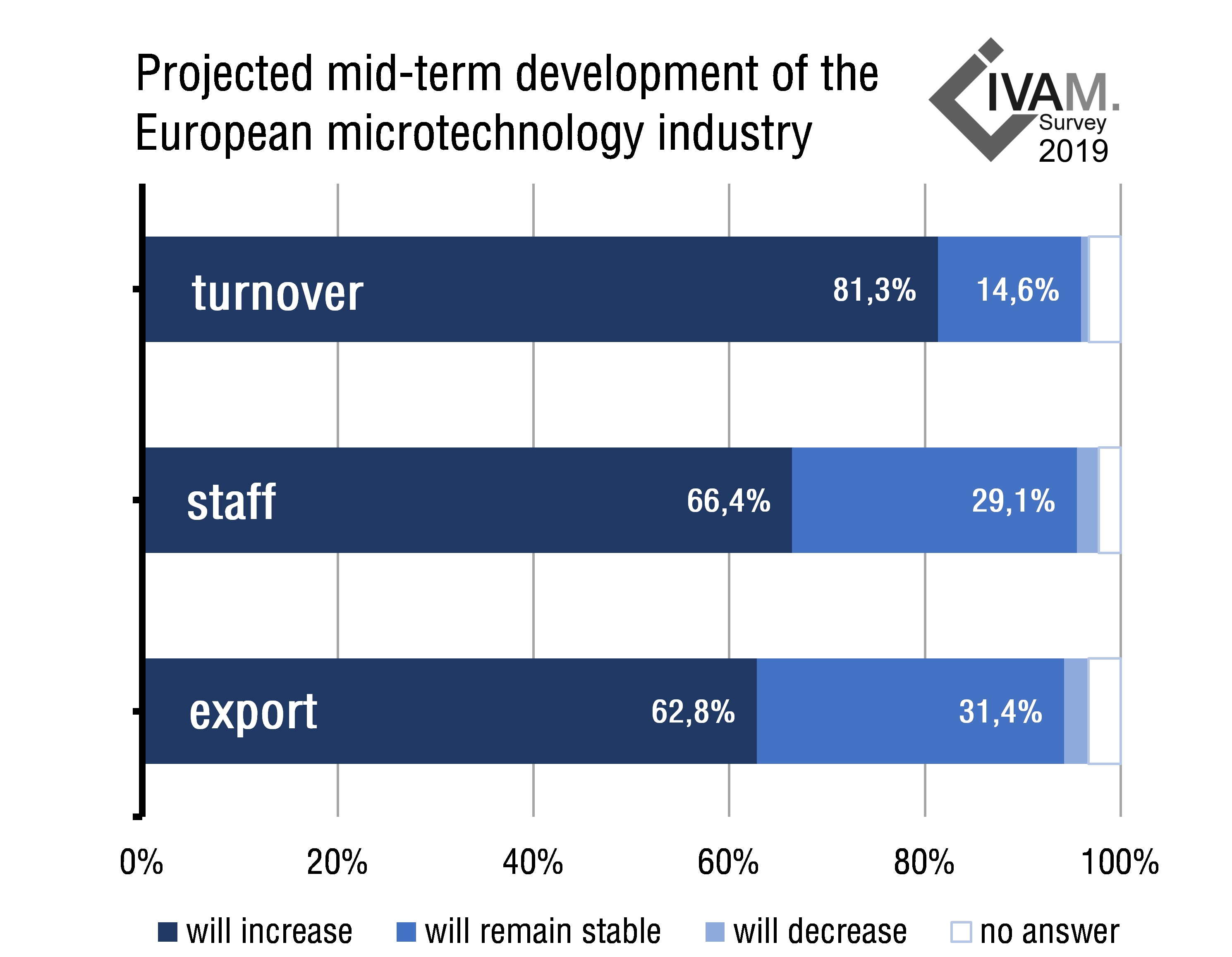 The results of the survey the IVAM Microtechnology Network carried out in February and March do not predict a major departure from the positive economic development of recent years. More than 80 percent of European microtechnology companies expect sales to increase over the next three years, two-thirds of companies plan to hire new employees over the same period, and more than 60 percent of companies plan to increase their export share in the medium term.