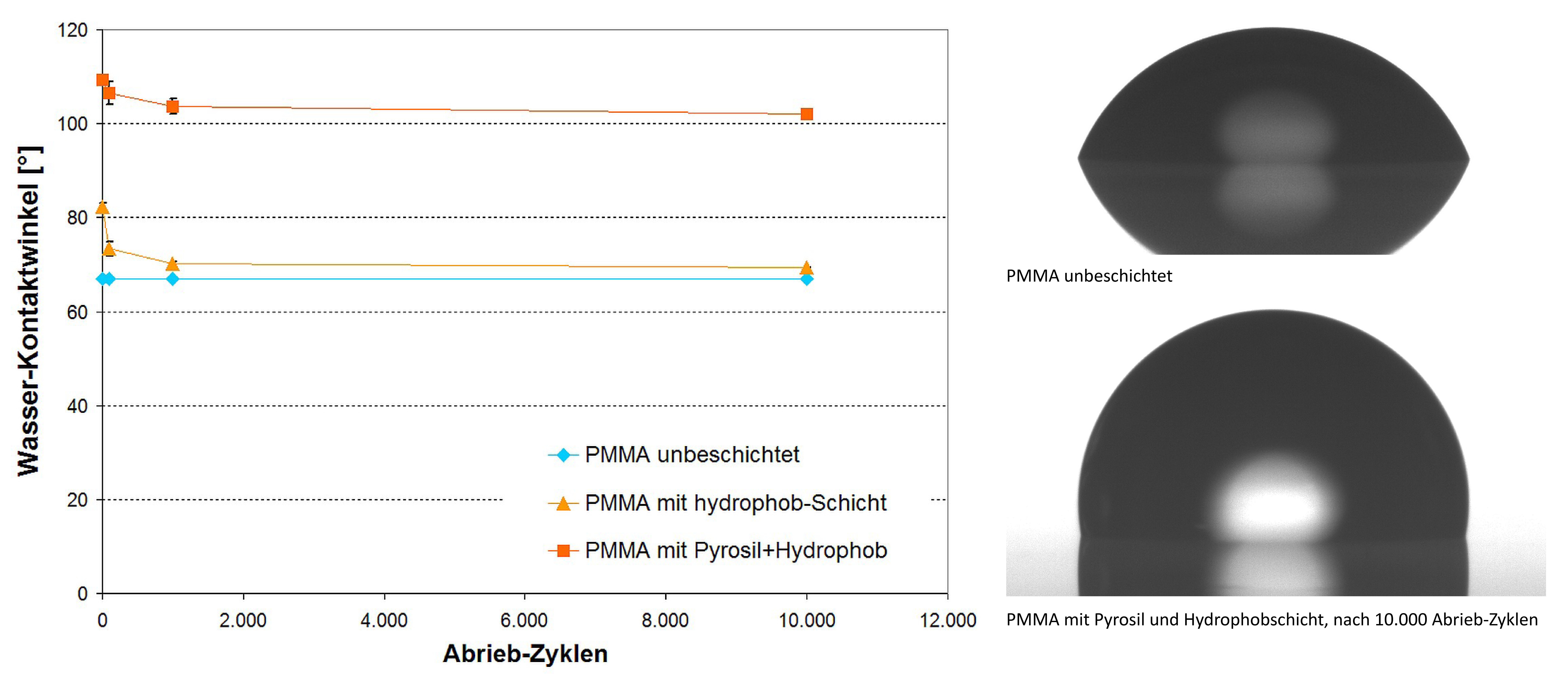 Eine Behandlung metallischer Oberflächen mit natürlicher Oxidbildung ist ohne größeren Aufwand möglich. Auf nicht-oxidischen Materialien, z.B. Kunststoffen, kann die Anbindung nach entsprechender Vorbehandlung, z.B. durch das Aufbringen einer dünnen Pyrosil®-Schicht, ebenfalls haftfest erfolgen. In einem Abriebstest konnte die Stabilität der Beschichtungen auf den Kunststoff-Substraten (Plexiglas) auch nach 10.000 Zyklen erfolgreich nachgewiesen werden (siehe Abb. 2).