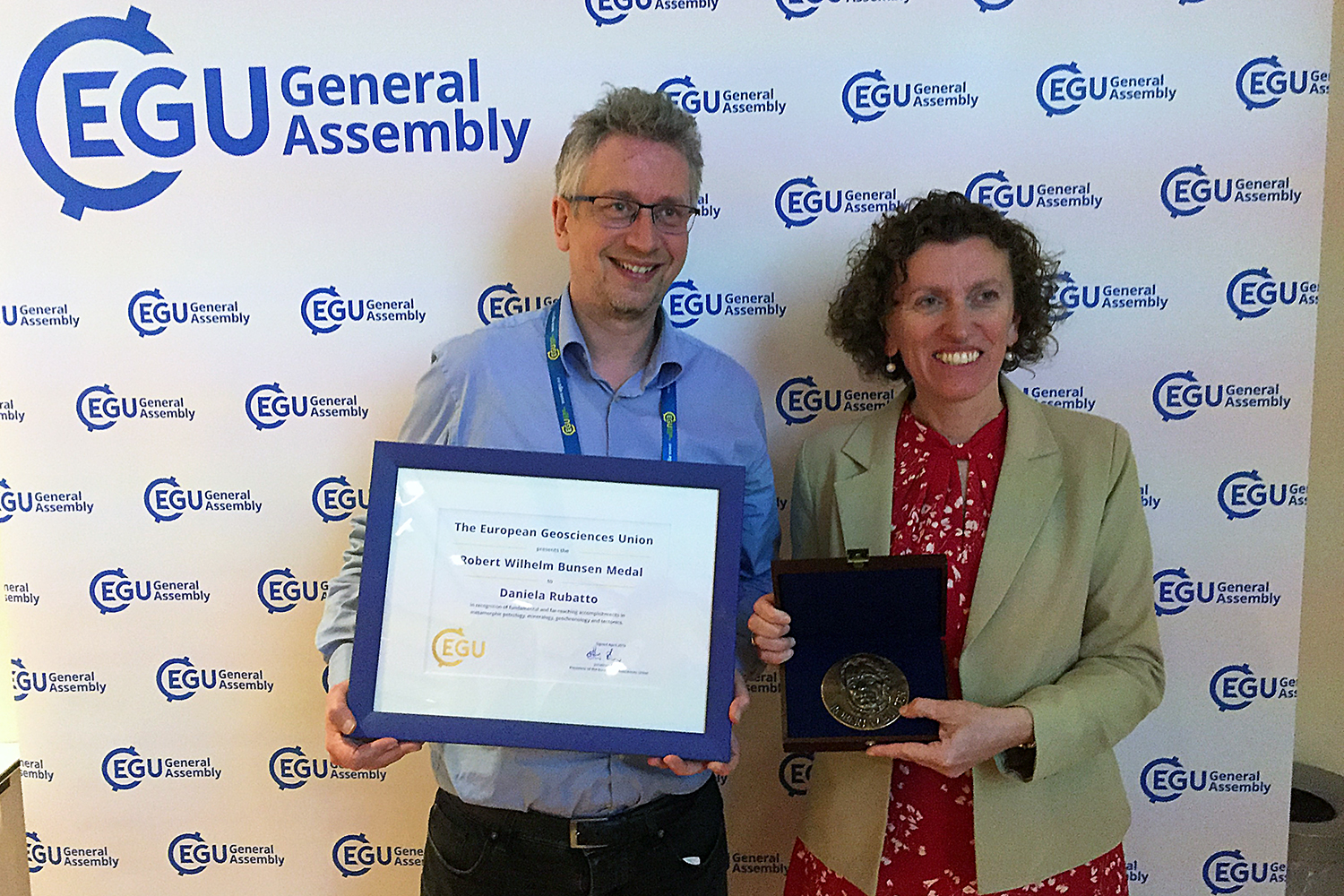 Daniela Rubatto erhielt am 9. April 2019 die renommierte Robert Wilhelm Bunsen-Medaille der European Geosciences Union (EGU). Die Preisvergabe würdigt insbesondere ihre Forschung zum Spurenelementgehalt des Minerals Zirkon und damit verbundenen gesteinsbildenden Mineralien. Rubattos Forschungsansatz stellt einen neuen Weg dar, um dynamische geologische Prozesse über lange Zeiten und weite Räume zu verstehen und zu quantifizieren.