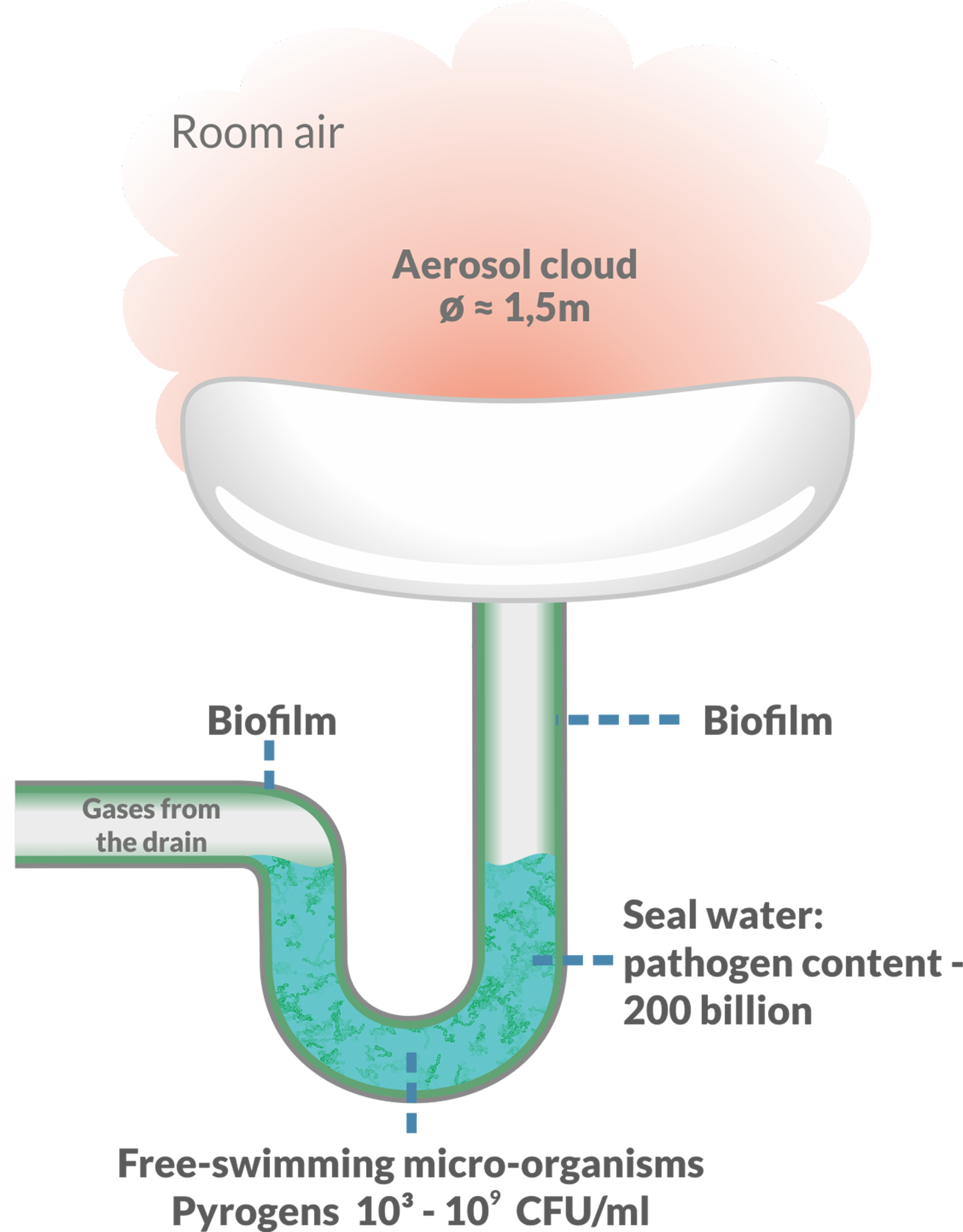 One of the many sources of this is the hospital water system. While primary water is sterilized, bacteria can enter the hospital almost unhindered via the drainage system. As a large-scale study[2] has shown, bacteriological colonization first takes place via the sewage pipes connected to the odour trap in the sink drain that contains water, called the siphon. If the water tap is opened, primary water flows down through the drain. At the same time, the air mass above the water in the siphon is forced upwards into the sink – pulling bacteria with it. These bacteria can be detected in a roughly three-foot radius of the sink. And since there is always a person near the sink when the water is running, it can be assumed that bacteria can practically always be transmitted this way. Fortunately, not every contact with bacteria immediately leads to an illness. On the contrary, most bacteria in and around our bodies are valuable helpers. Nevertheless, pathogenic pathogens can also spread in the manner described. Hospitals also often have patients with weakened immune systems, which makes them particularly susceptible to bacterial infections.