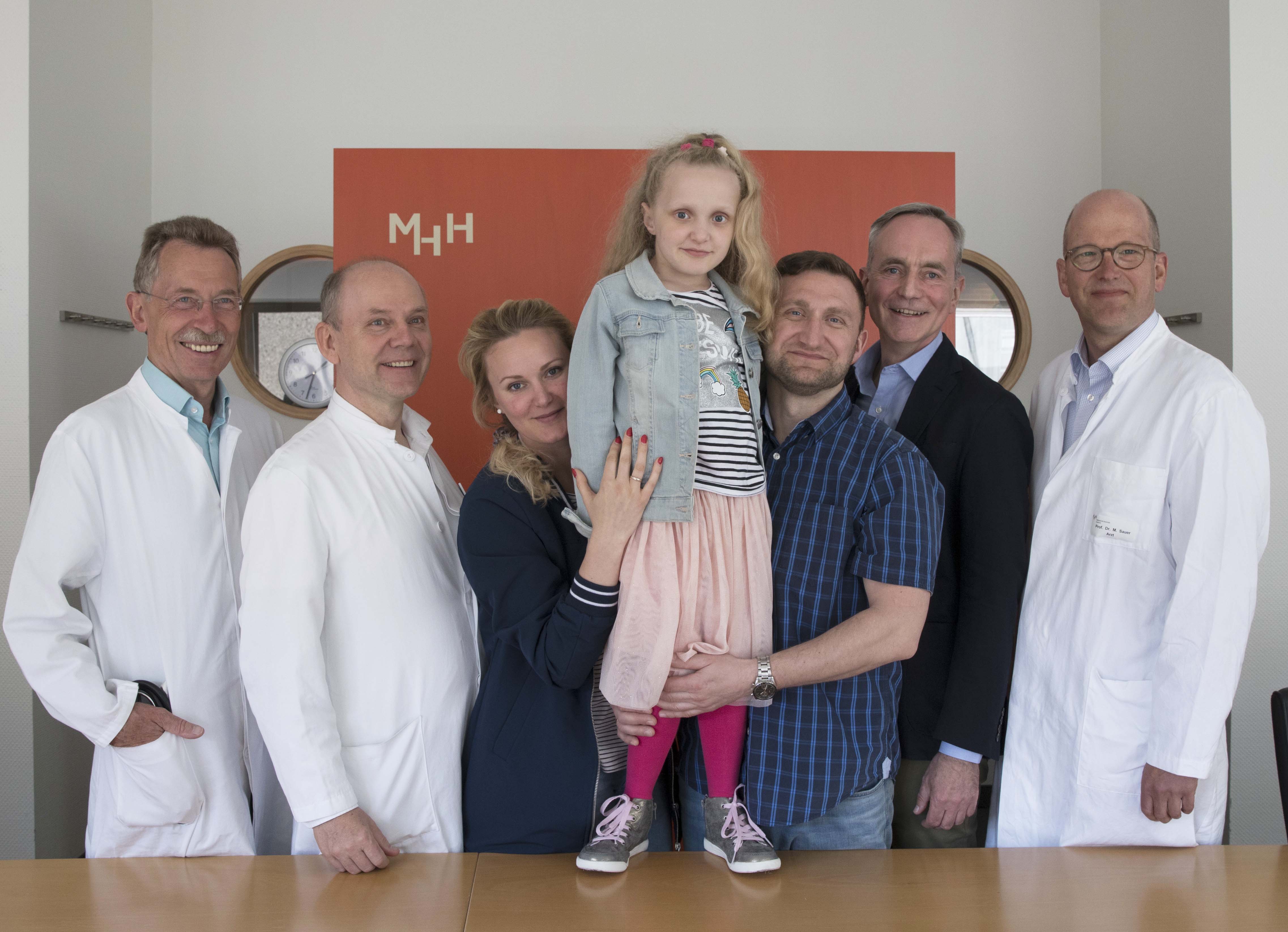 Ein Foto ist angefügt. Es zeigt Ayleen Sophie mit Ihren Eltern Anna und Johann H. (Bildmitte) sowie den Professoren Schmidt und Baumann (von links) und Professor Sauer und Dr. Dr. Janzen (von rechts). Sie können das Foto im Zusammenhang mit dieser Presseinformation kostenfrei verwenden, wenn Sie als Quelle „MHH/Kaiser“ angeben.