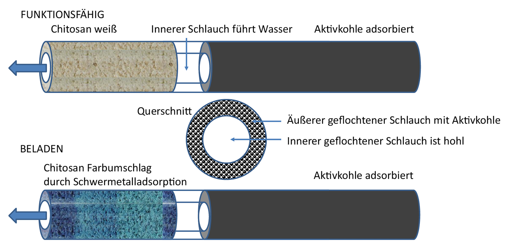 Bestandteil der Tropfleitung soll eine "aktive Textilpatrone" sein, die in der Lage ist, die Schwermetall- und Organikkonzentration in einem flüssigen Substitutionsdünger aus Gärrückständen so weit abzusenken, dass dieser problemlos in der Lebensmittelproduktion eingesetzt werden kann. "Der Aufbau der Tropferpatrone wird so erfolgen, dass eine feste Korrelation zwischen den organischen und Schwermetallverbindungen besteht. Dadurch kann die Einsatzdauer der Tropfleitung kontrolliert werden und deren maximale Beladung wird mittels Farbumschlag durch die adsorbierten Schwermetallionen an Chitosan angezeigt", so Prof. Dr. Frank Kolb auf Nachfrage. Das ermöglicht eine erweiterte Nutzung des flüssigen Gärrückstandes in Form eines organischen Düngemittels mit hohen Stickstoff- und Phosphoranteilen.