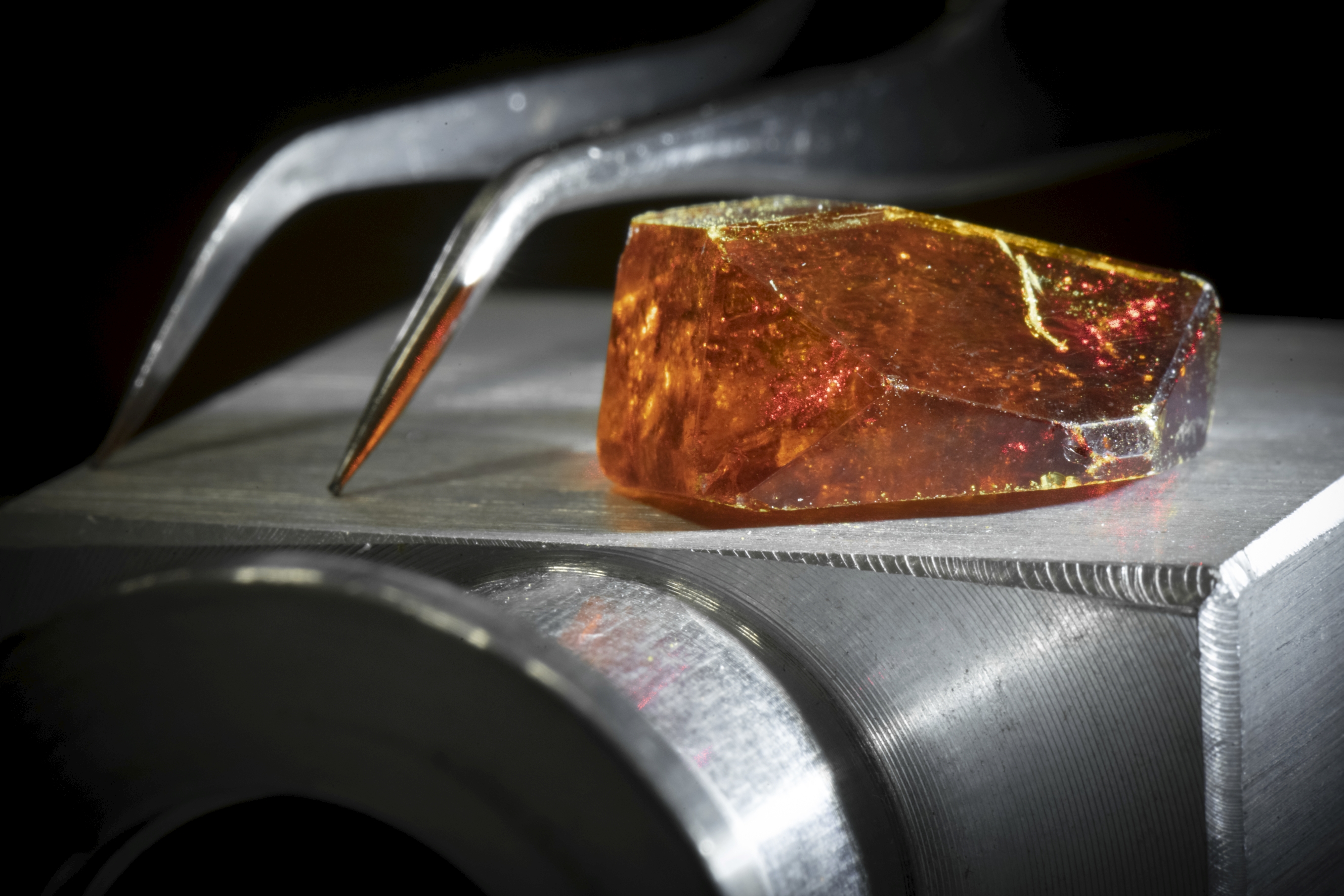 „Mit der neuen Methode können wir die Kopplungsparameter innerhalb des Kristalls kontrollieren und gleichzeitig die Auswirkungen auf die magnetischen Eigenschaften messen“, sagt Sergei Zvyagin. Die CCC-Kristalle für seine Experimente erhielt er von der Gruppe um Dr. Hidekazu Tanaka vom Tokyo Institute of Technology. Mit wenigen Millimeter Kantenlänge erinnern sie mit ihrer orange schimmernden Transparenz eher an helle Granat-Edelsteine als an künstliche, im Labor gezüchtete Kristalle. Ebenfalls in Japan an der Tohoku University in Sendai setzten Zvyagin und Kollegen die Kristalle in eine Hochdruckpresse mit Stempeln aus hochfestem Zirkonoxid. Damit erhöhten die Forscher die Belastung nach und nach auf rund zwei Gigapascal. Ein vergleichbarer Druck wirkt, wenn das Gewicht eines Autos auf einer Fläche von der Größe einer Buntstiftmine lastet.