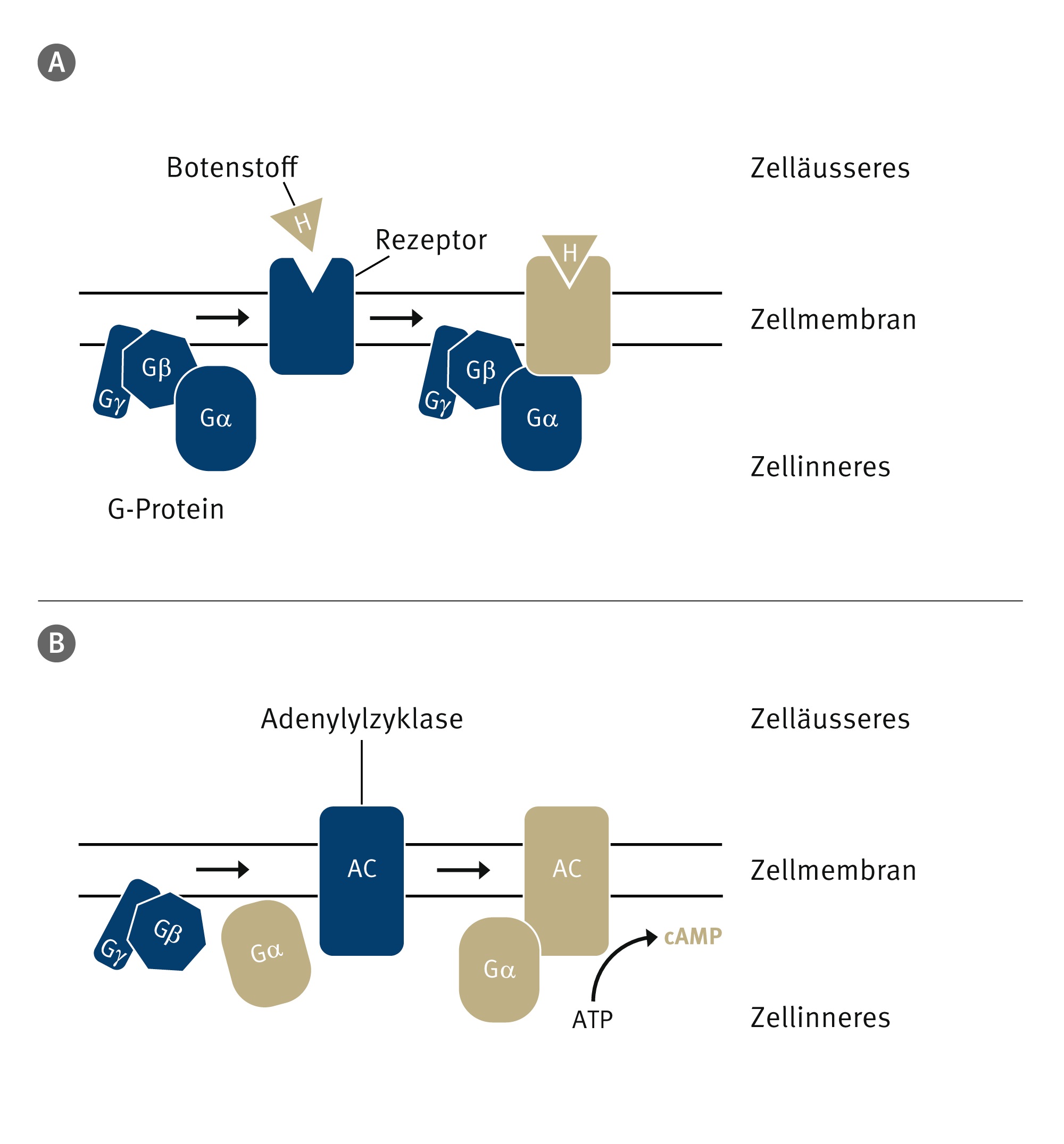 Ein wichtiger Signalweg bei Säugetieren besteht aus drei Komponenten: Erstens einem Rezeptor, der das Signal erkennt und dadurch aktiviert wird. Zweitens einem sogenannten G-Protein, das an den aktivierten Rezeptor bindet und das Signal an ein oder mehrere Effektorproteine weiterleitet. In diesem Fall ist der Effektor die Adenylylzyklase, die dritte Komponente der Signalkette. Dieses Protein wird durch eine Untereinheit des G-Proteins aktiviert und produziert in einer biochemischen Reaktion einen sekundären Botenstoff, das sogenannte zyklische AMP (cAMP).