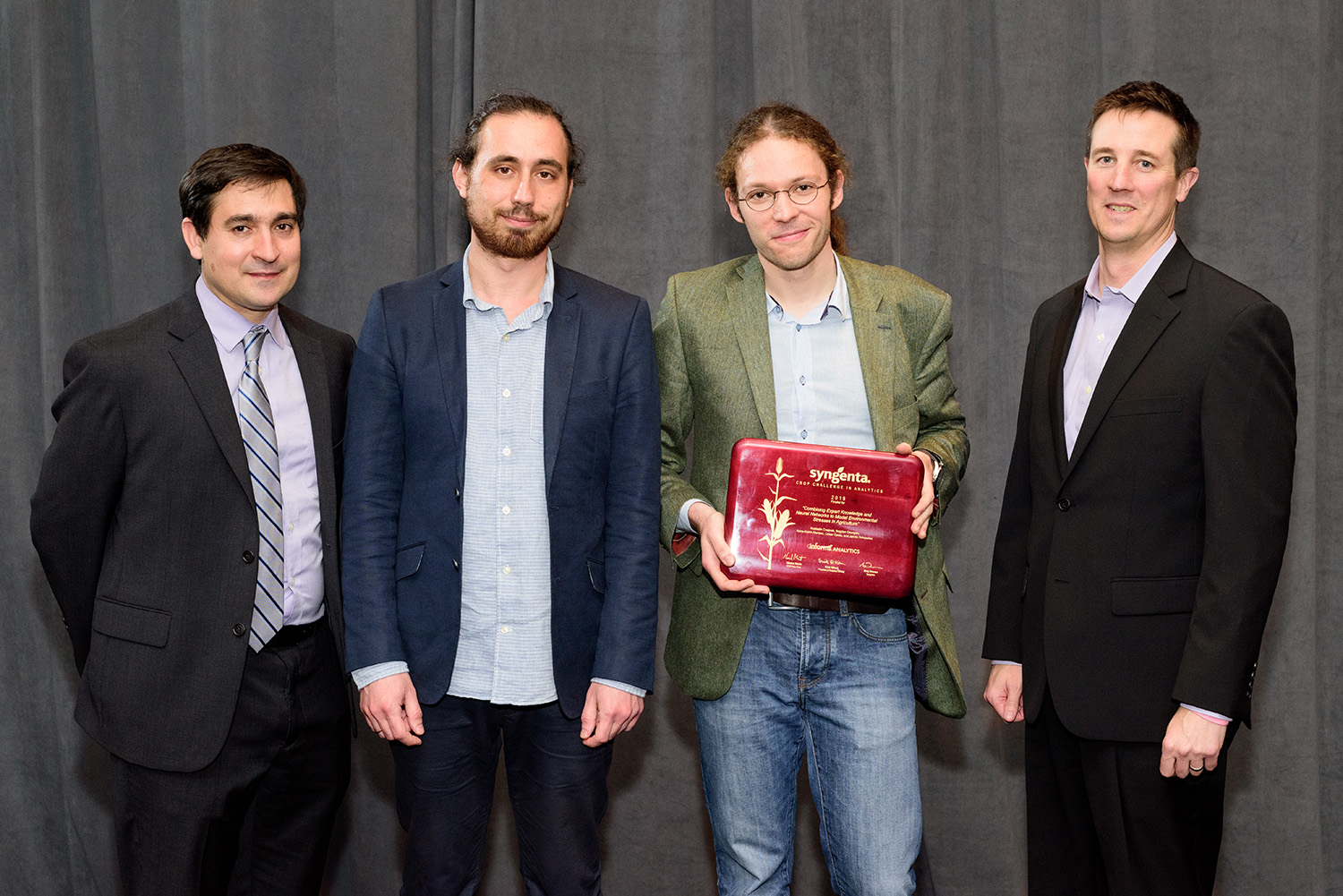 Besseres Saatgut, weniger Düngemittel, hohe Anpassungsfähigkeit – die intelligente Datenanalyse kann die Landwirtschaft nachhaltig und gewinnbringend unterstützen. Auf der Suche nach den besten Technologien lobt der globale Agrarkonzern Syngenta einmal jährlich die »Crop Challenge in Analytics« aus. Beim Finale in Austin, Texas, überzeugte die Technologie auf Basis des »Informed Machine Learnings« die Jury: Den ersten Platz belegten die Wissenschaftler Dr. Bogdan Georgiev, Kostadin Cvejoski, Cesar Ojeda und Dr. Jannis Schücker vom Fraunhofer-Forschungszentrum Maschinelles Lernen, unter Leitung des Fraunhofer-Instituts für Intelligente Analyse- und Informationssysteme IAIS, und die Agrarwissenschaftlerin Prof. Dr. Anne-Katrin Mahlein, Forschungsleiterin im Exzellenzcluster Phenorob der Universität Bonn, an dem auch das Fraunhofer IAIS beteiligt ist.