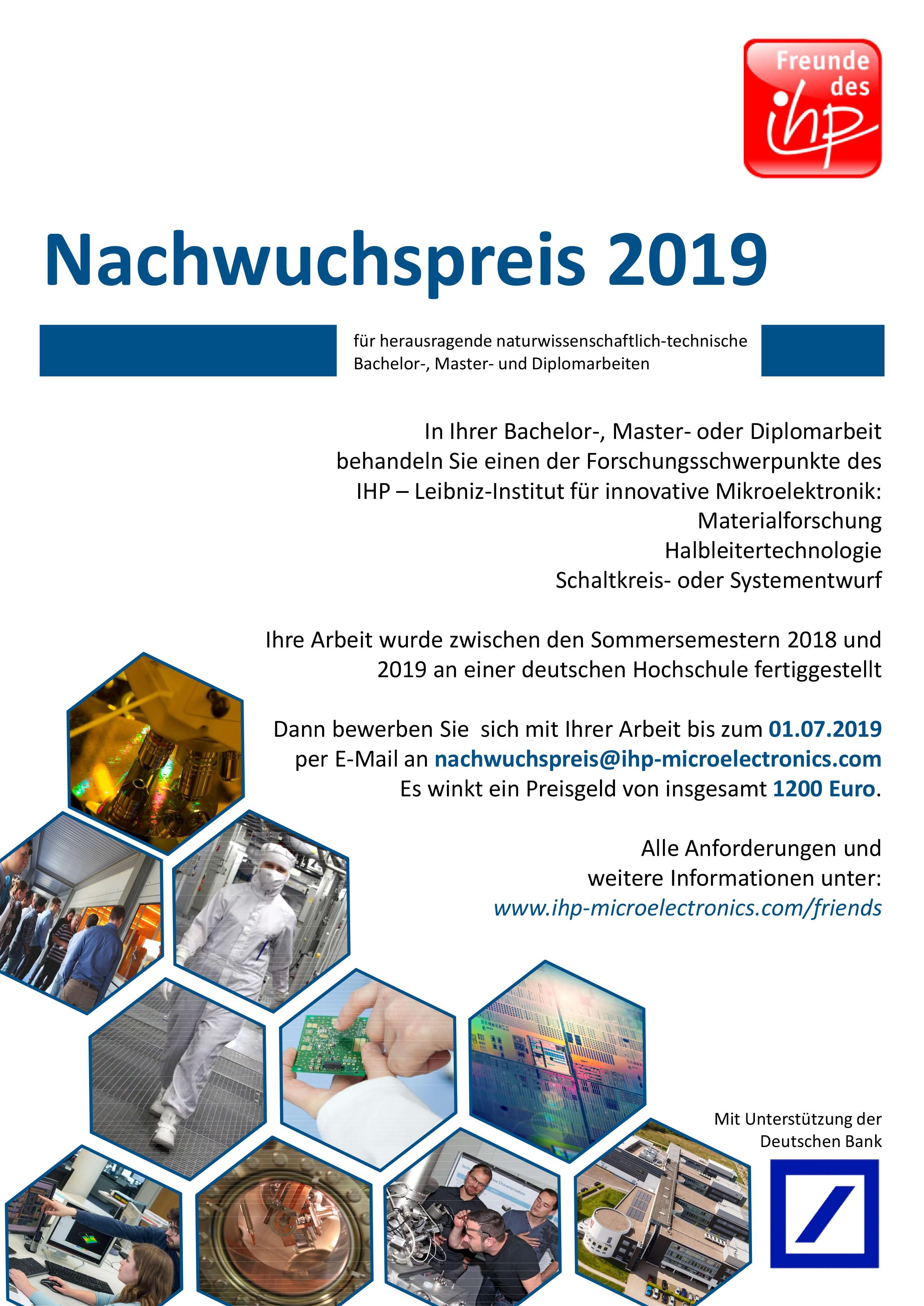 Jetzt bewerben! Herausregende Bachelor-, Master- und Diplomarbeiten haben die Chance, mit dem deutschlandweiten Nachwuchspreis der „Freunde des IHP“ ausgezeichnet zu werden. Gesucht werden Arbeiten, die thematisch zu den Forschungsgebieten des IHP – Leibniz-Institut für innovative Mikroelektronik passen. Diese sind siliziumbasierten Systeme, Höchstfrequenz-Schaltungen und -Technologien einschließlich neuer Ma-terialien. Die Preise sind mit insgesamt 1.200 Euro dotiert. Unterstützung erhält der Förderverein „Freunde des IHP e. V.“ seit dem Jahr 2008 von der Deutschen Bank, die den 1. Preis in Höhe von 500 Euro stiftet. Mit dem jährlichen Nachwuchspreis werden junge Forscherinnen und For-scher unterstützt und animiert, die wissenschaftliche Karriere fortzuführ-ten.