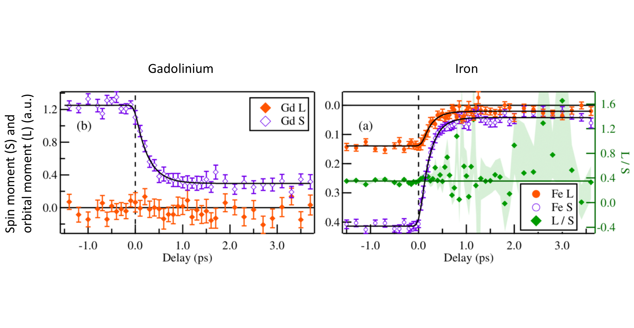 Zeitlicher Verlauf des Spin (S)- und Bahndrehimpulses (L) von Gd und Fe in der Legierung. Zu Beginn besitzt Gd keinen Drehimpuls (L=0), und auch während der Entmagnetisierung ist nach Auftreffen des Laserpulses auf die Probe zum Zeitpunkt Null keine Zunahme zu sehen. In Fe nehmen sowohl S als auch L mit gleicher Geschwindigkeit ab, ohne dass eine Umverteilung zwischen S und L erkennbar ist.