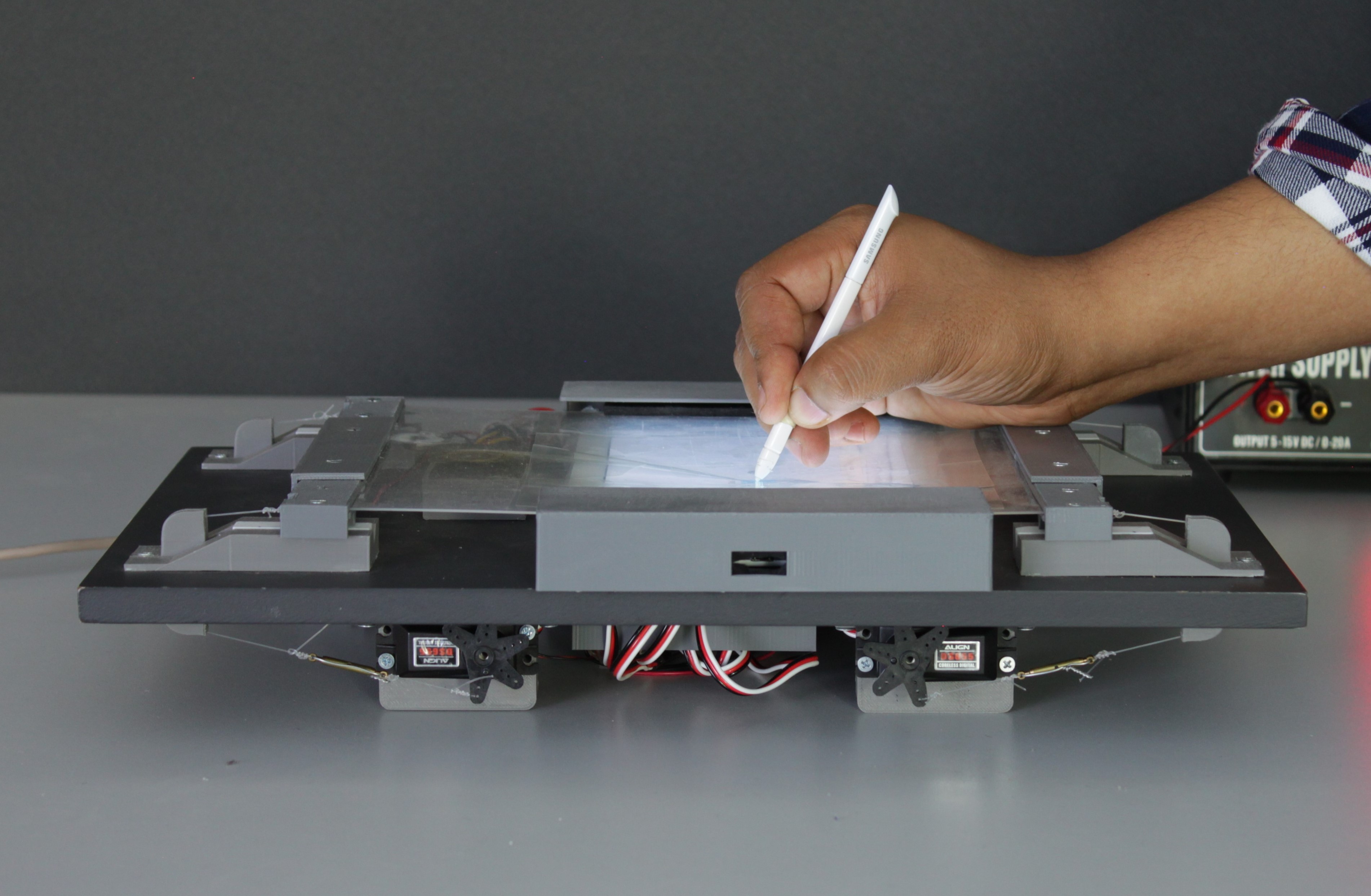 Die motorgesteuerte Oberflächenspannung der Folie spielt bei den unterschiedlichen Arten von Simulationen in mehrfacher Hinsicht eine zentrale Rolle. In Abhängigkeit von der Spannung werden zunächst Erhebungen der Abbildungen auf dem Tablet spürbar – aus einer zweidimensionalen Darstellung wird gefühlt eine dreidimensionale Erfahrung. Zudem kann durch Adaption der Oberfläche der Stift leicht bewegt werden, um beispielsweise die Nutzereingabe zu unterstützen oder zu korrigieren. Somit könnten auch Nutzer zukünftiger Versionen des Systems beim Schreiben lernen, auf der Linie zu bleiben.