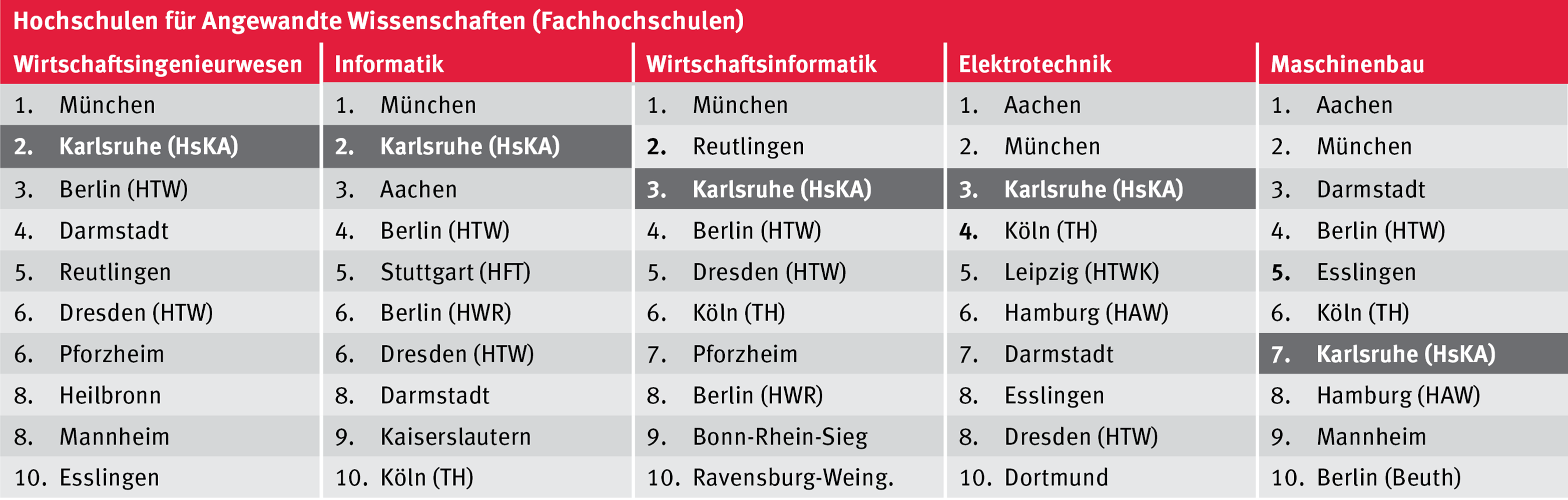 In der Informatik und im Wirtschaftsingenieurwesen ist die Hochschule Karlsruhe nach Ansicht der Personalmanager bundesweit eine der beiden Hochschulen für Angewandte Wissenschaften (Fachhochschulen), die ihre Absolventen am besten auf den Beruf und damit auf die Karriere vorbereitet – also jeweils Rang 2 im aktuellen Hochschulranking. In der Elektrotechnik erreicht sie Platz 3 wie auch in der Wirtschaftsinformatik. Im Maschinenbau erreicht sie einen immer noch sehr guten 7. Rang und zählt somit in fünf der sechs bewerteten Disziplinen bundesweit zu den Top Ten. In der Summe ist die Hochschule Karlsruhe aus Sicht der Personalverantwortlichen bundesweit einer der drei besten Hochschulen für Angewandte Wissenschaften (Fachhochschulen).