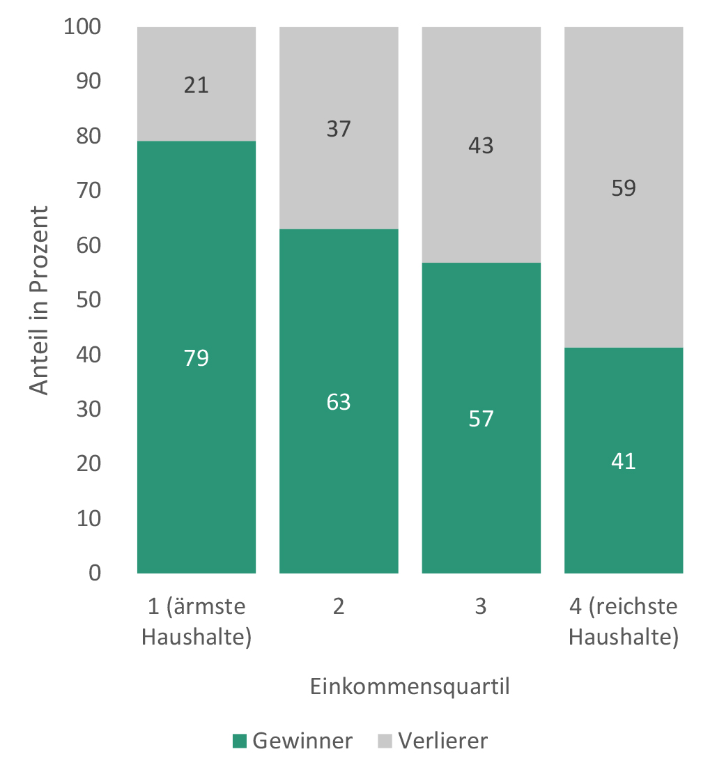 Wie die Analyse verschiedener Einkommensgruppen in der Abbildung veranschaulicht, würden unter den ärmsten Haushalten in Deutschland fast 80 Prozent von einer solchen CO2-Steuer profitieren. Lediglich die reichsten Haushalte würden mehrheitlich belastet werden. Die beobachtete Verteilungswirkung ist dabei unabhängig von der konkreten Höhe der CO2-Steuer. Insgesamt würde dieser Reformvorschlag für 60 Prozent der Haushalte eine Entlastung bedeuten.