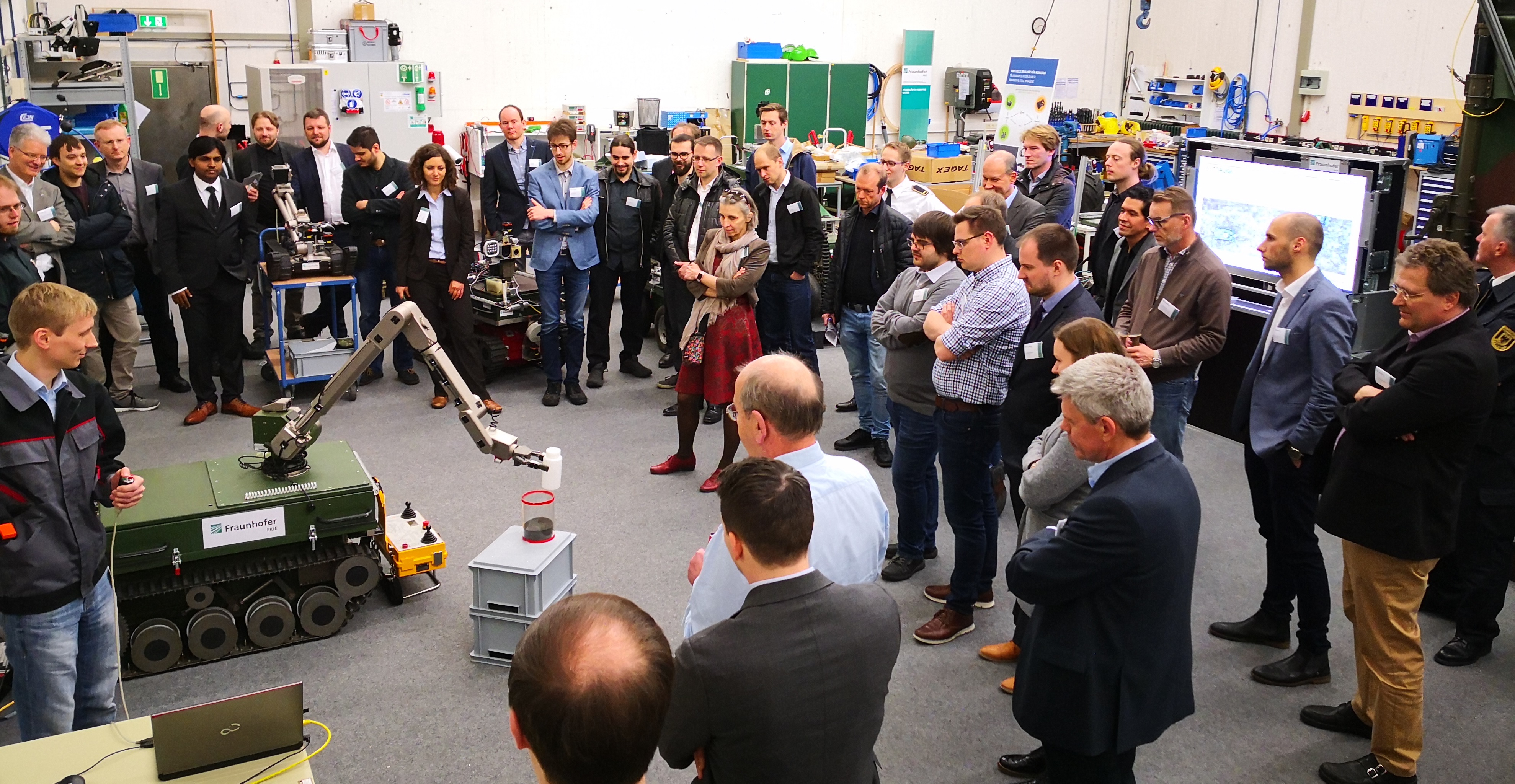 Das Projektkonsortium unter der Leitung der Feuerwehr Dortmund hatte für das erste Arbeitstreffen drei Schwerpunkte gesetzt: die Vorstellung erster Ergebnisse, ein fachlicher Ideenaustausch sowie die Präsentation von Exponaten und Demonstratoren. Hierfür erwies sich das Fraunhofer FKIE als optimal gewählter Veranstaltungsort. Das Institut verfügt über langjährige Erfahrung in der Entwicklung von Demonstratoren und konnte den Partnern ein umfangreiches Arsenal an Hardware zur Bewältigung vielfältigster Aufgaben in gefährlichen, menschenfeindlichen Umgebungen vorstellen.
