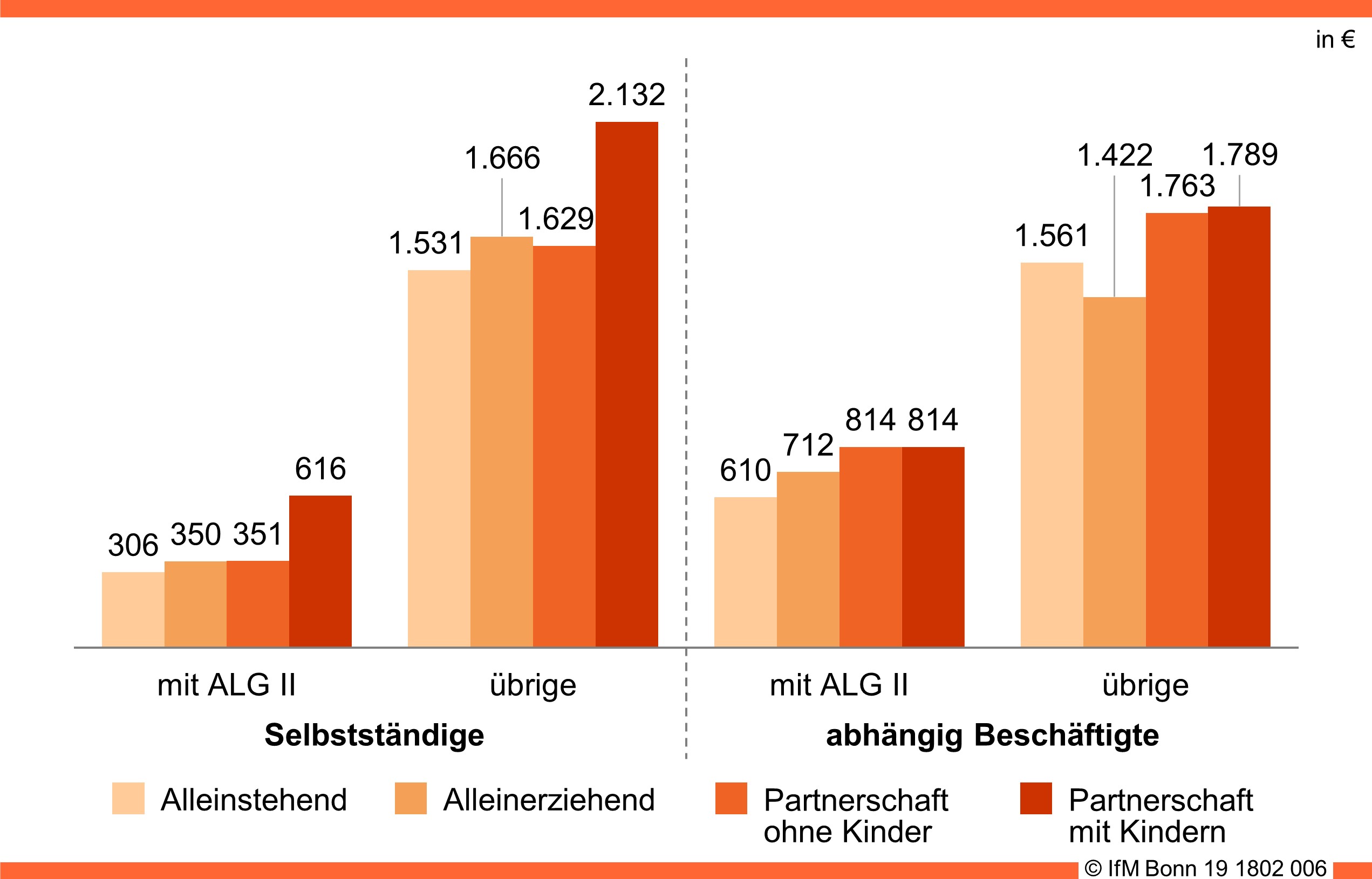 Das monatliche Nettoeinkommen von Selbstständigen, die staatliche Leistungen beziehen, liegt im Durchschnitt mit 390 Euro deutlich unter dem von abhängig Beschäftigten in der Grundsicherung (746 Euro). "Ein wesentlicher Grund, warum Selbstständige zusätzlich Arbeitslosengeld II beantragen, sind Unternehmenskrisen. In diesen Phasen können die Unternehmer und Freiberufler trotz intensiver Arbeitsleistung kein ausreichendes Einkommen erwirtschaften", berichtet Hans-Jürgen Wolter, Leiter des Studienprojekts. Nach Untersuchungen der IfM-Wissenschaftler hat sich das Einkommen der Selbstständigen vor Eintritt in die Grundsicherung im Durchschnitt um rund 60 % reduziert. Mehr als ein Viertel von ihnen brauchte zunächst die eigenen Ersparnisse auf, bevor sie Arbeitslosengeld II beantragten.