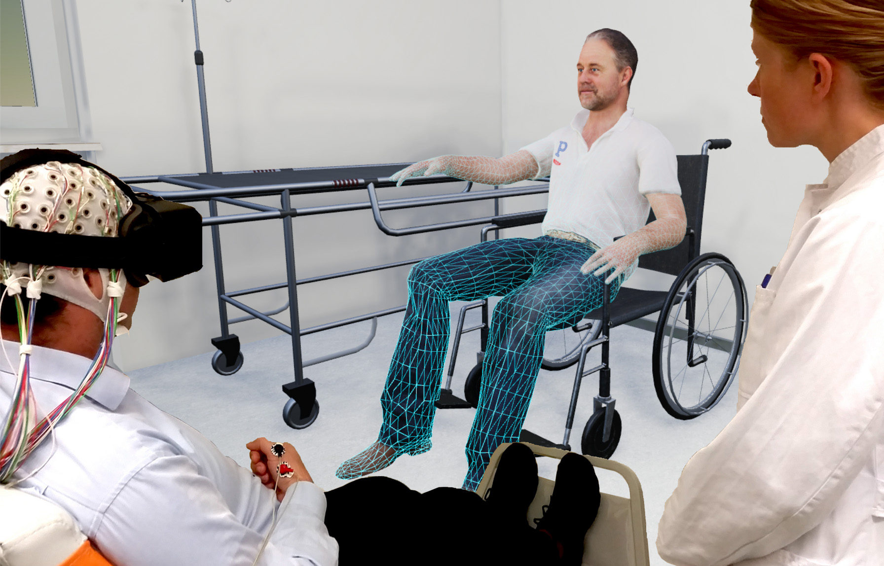 „Mit „Rehality“ soll der Patient in Bewegung gebracht werden. Dabei trainiert er neue Aktivitätsmuster im Gehirn. Langfristig sollen die Muster gestärkt werden, die effizient zu einer Bewegung führen“, erklärt Projektkoordinator Dr. Christoph Zrenner. Im virtuellen Raum sieht der Patient, wie sich etwa seine gelähmte Hand hebt. Der Trick: Durch das closed-loop Paradigma wird ihm immer nur dann eine virtuelle Bewegung angezeigt, wenn der Proband tatsächlich mit maximaler Mühe versucht, die Hand zu bewegen.