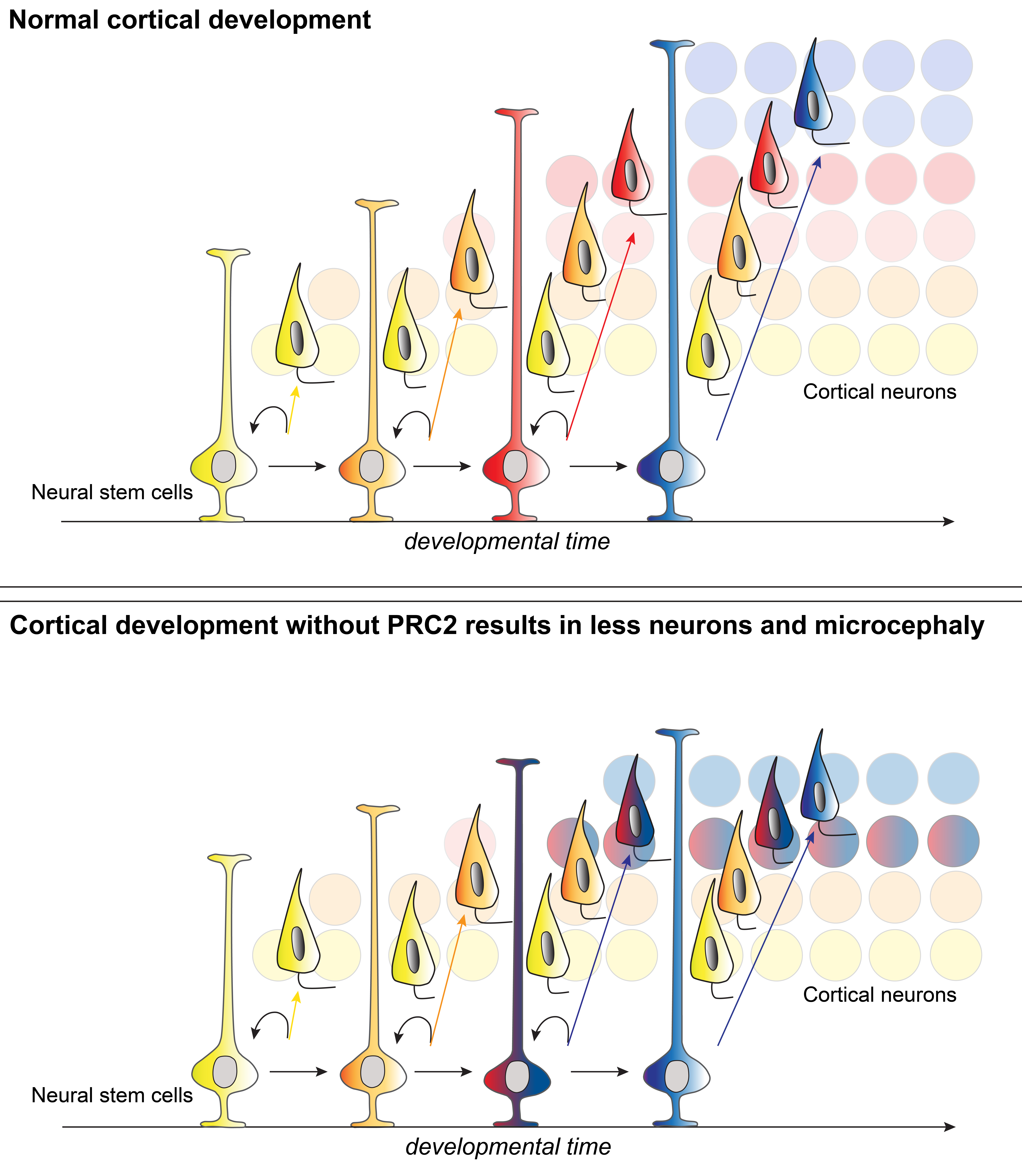 The researchers suspected that specific regulatory proteins could be involved in the control of the time-dependent activation of distinct gene expression programs. They identified a protein complex, the so-called Polycomb Repressive Complex 2 (PRC2) to be highly expressed only in early-stage stem cells, but not in late-stage ones. The question, whether PRC2 does indeed regulate temporal maturation of stem cells could only be answered in a collaboration of the Swiss and researchers with Simon Hippenmeyer and postdoc Nicole Amberg from IST Austria. By using mouse genetic approaches the IST Austria researchers succeeded in eliminating all PRC2 activity in cortical stem cells during development, i.e., at the time when distinct neuron types are being produced—and the results proved their hypothesis right.