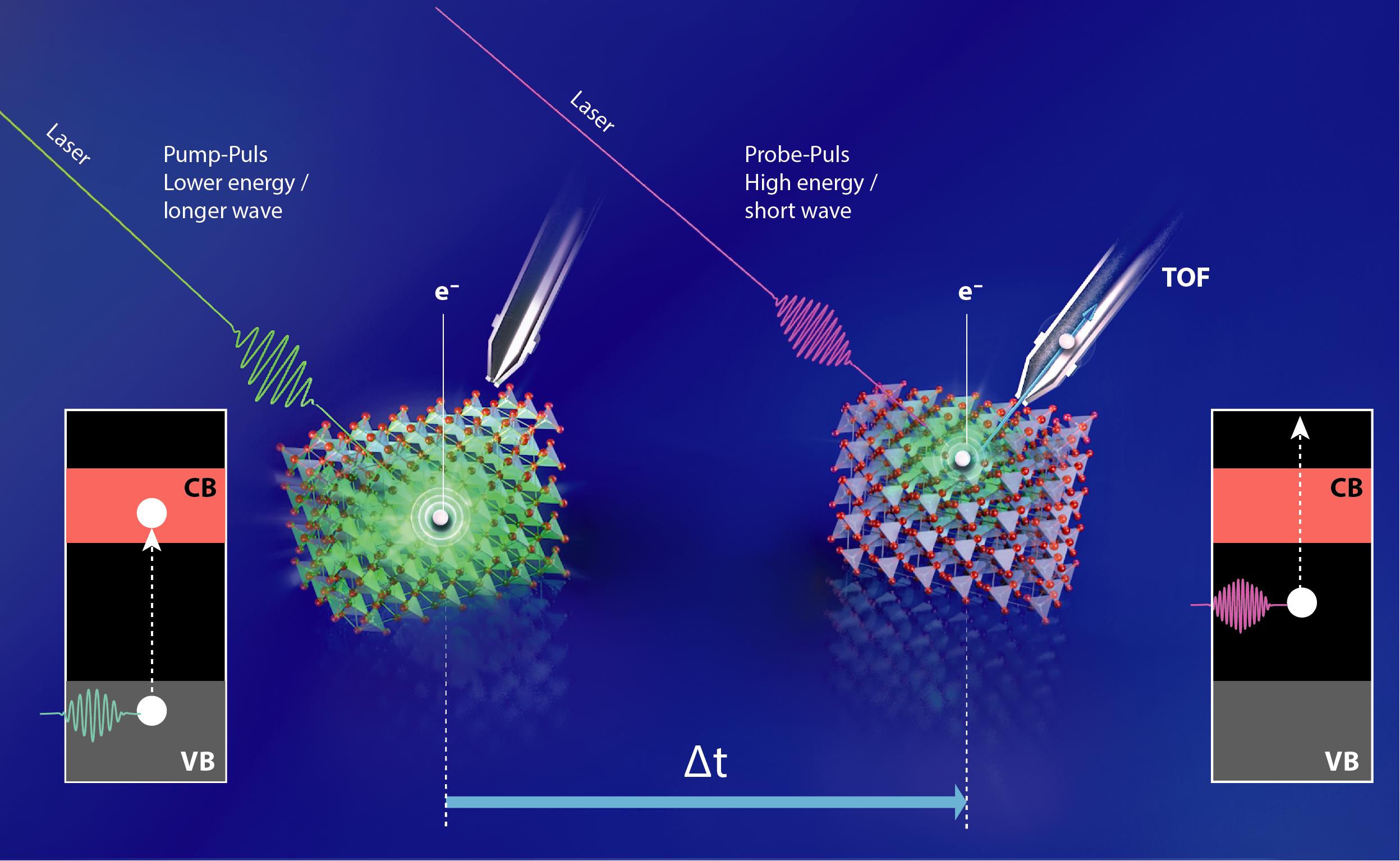 Dafür regte ein erster Laserpuls im sichtbaren grünen Bereich die Elektronen im Cu2O an; nur Bruchteile von Sekunden später folgte ein zweiter Laserpuls (UV-Licht), um die Energie des angeregten Elektrons zu messen. Mit dieser zeitaufgelösten Zwei-Photonen-Photoemissions-Spektroskopie (tr-2PPE) konnten sie den Hauptmechanismus von Photospannungsverlusten identifizieren. „Wir beobachteten, dass die angeregten Elektronen sehr schnell in Defektzuständen gebunden werden, die in der Bandlücke selbst in großer Zahl existieren“, berichtet Erstautor Mario Borgwardt, der inzwischen seine Arbeit als Humboldt-Stipendiat am Lawrence Berkeley National Laboratory in den USA fortsetzt. Der Koordinator der Studie Dennis Friedrich führt aus: „Dies geschieht auf einer Zeitskala von unter einer Pikosekunde, also extrem schnell, vor allem im Vergleich zu der Zeit, in der Ladungen aus dem Inneren des kristallinen Materials an die Oberfläche diffundieren können.“