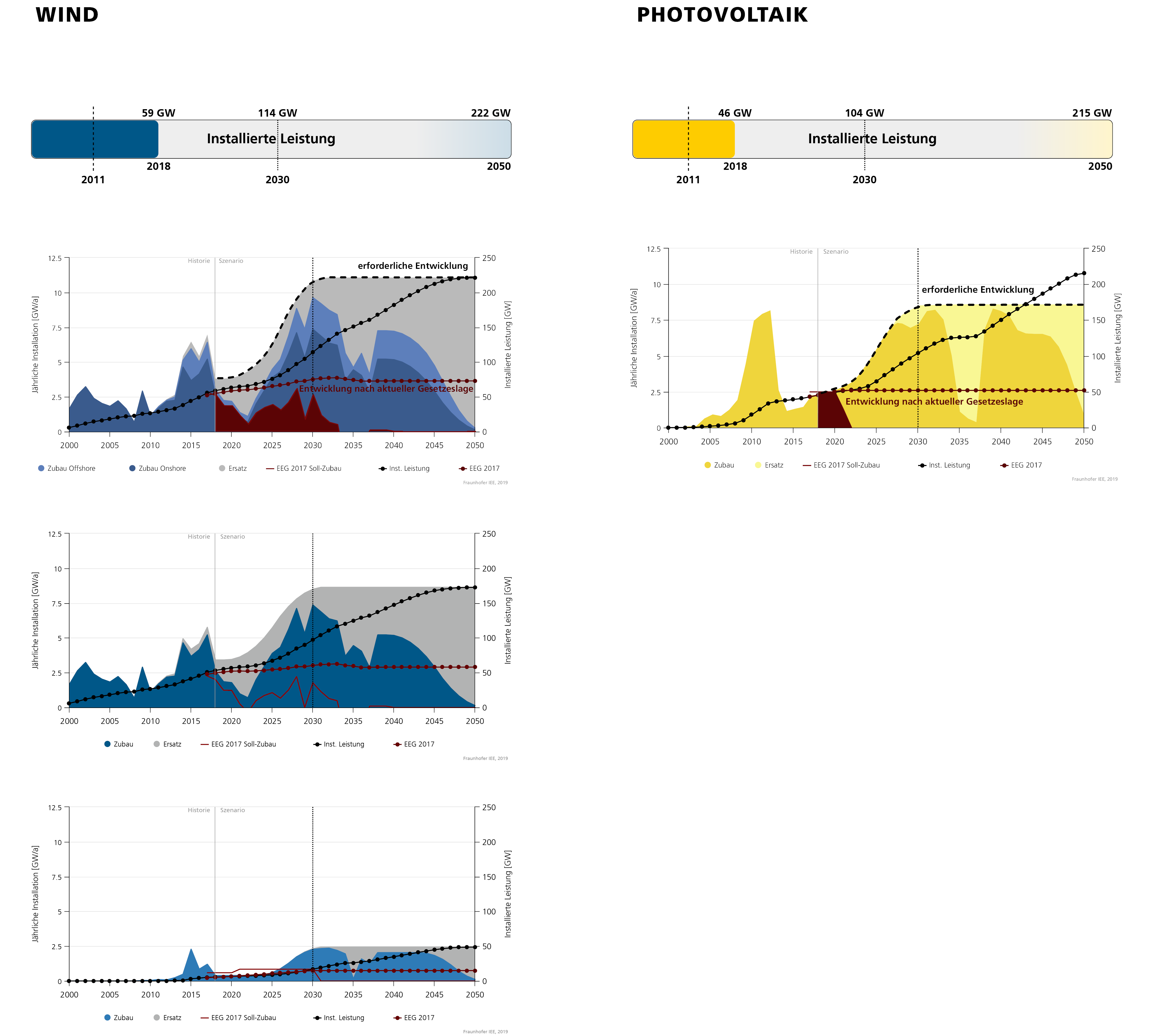 »Der Zubau in der Windenergie lag 2018 bei 3,82 GW Leistung für Onshore und Offshore zusammen (Brutto-Zubau, also Neu- und Ersatzinstallationen). Um die in Paris vereinbarten Klimaziele einer 95%igen Minderung von Treibhausgasen noch erreichen zu können, müssen wir nach unseren Szenario-Modellierungen diese Rate bis 2030 auf rund 11 GW pro Jahr, also etwa das Dreifache, steigern. Bei der Photovoltaik lag der Zubau in 2018 bei 2,3 GW. Hier muss der notwendige Zielzubau bis 2030 auf rund 8,5 GW pro Jahr, also etwa das 3,5 fache, wachsen«, bilanziert Prof. Hoffmann.