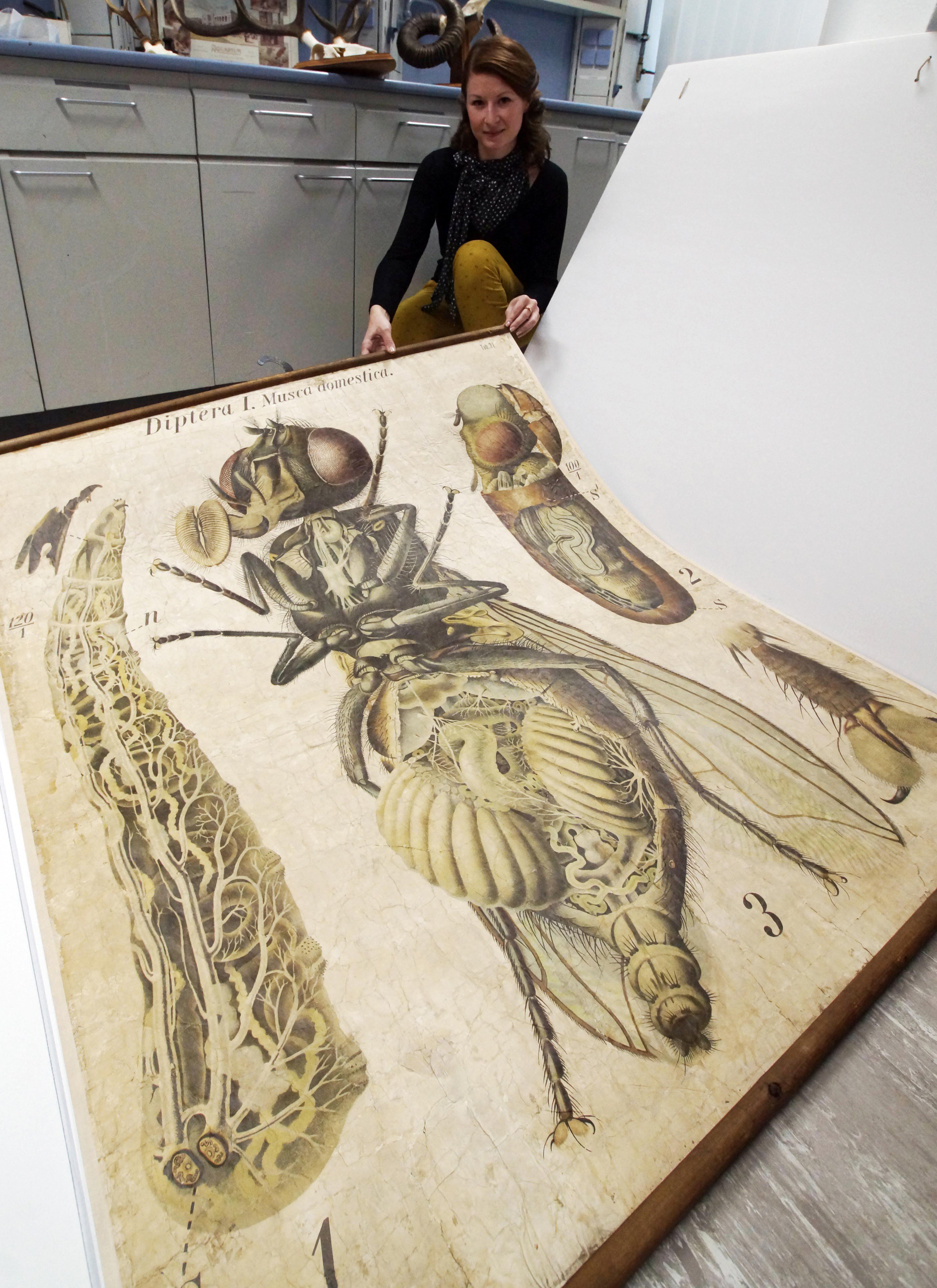 Wenn heute die Rollbildtafel der Stubenfliege in der Sammlung der Biologiedidaktik wieder glänzt, dann ist dies nur durch eine professionelle Restaurierung zu erreichen. Und so hat sich in den vergangenen Jahren eine erfolgreiche Kooperation zwischen der Jenaer Universität und dem Studiengang Konservierung und Restaurierung an der FH Erfurt entwickelt. Dort werden seit 1994 Restauratorinnen und Restauratoren ausgebildet. Die Studierenden werden befähigt, die ihnen anvertrauten Objekte einer adäquaten Behandlung zuzuführen, indem sie Konzepte entwickeln, diese sachgerecht umsetzen und präventive Maßnahmen zur Erhaltung, einschließlich einer möglichen Präsentation, vorschlagen.