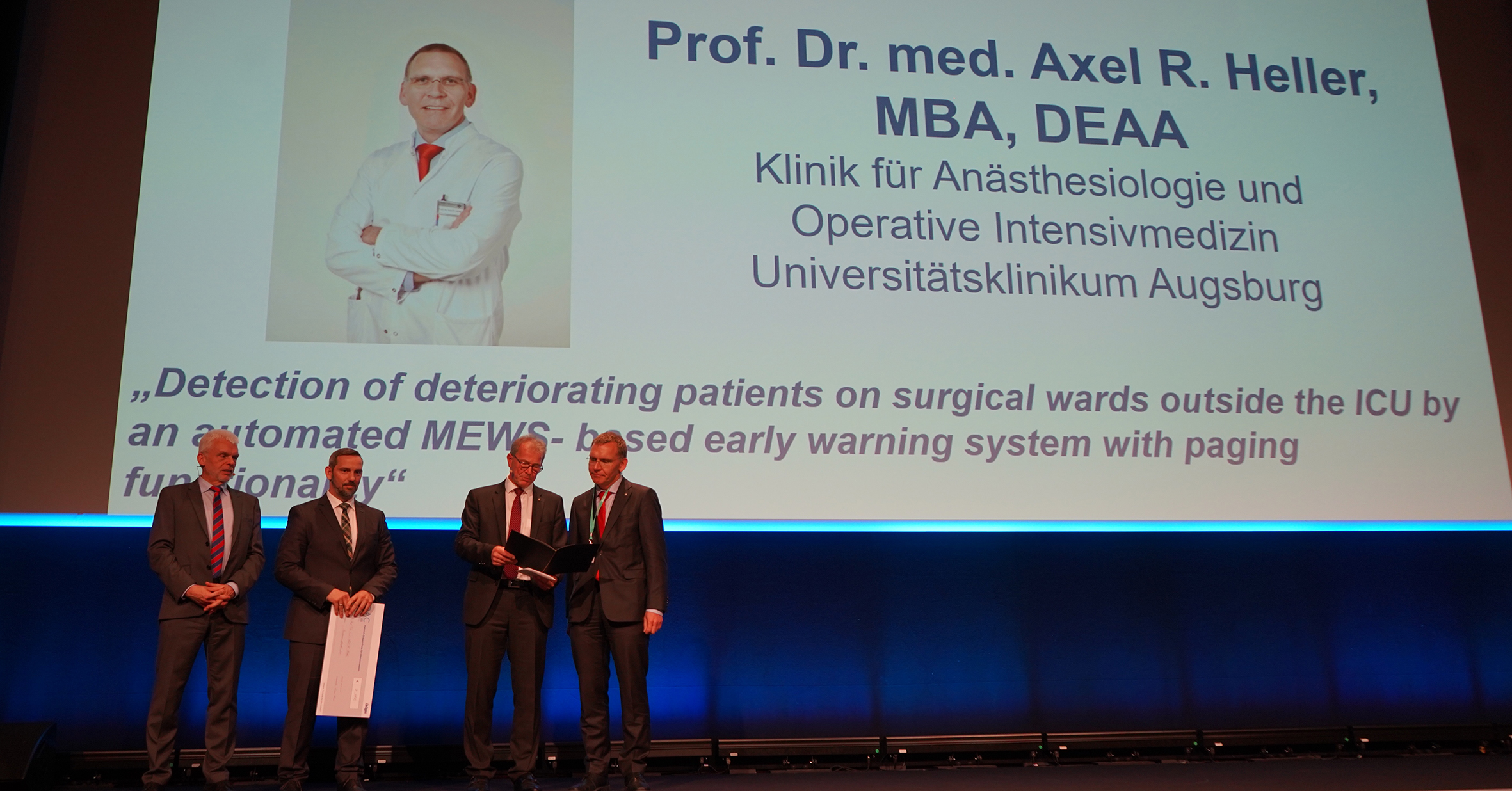 Prof. Dr. Axel R. Heller, Inhaber des Lehrstuhls für Anästhesiologie und Operative Intensivmedizin der Universität Augsburg und Direktor der gleichnamigen Klinik am Universitätsklinikum Augsburg, wurde anlässlich des Deutschen Anästhesiecongresses (DAC) am 9. Mai mit dem Heinrich-Dräger-Preis 2019 der Deutschen Gesellschaft für Anästhesiologie und lntensivmedizin e. V. (DGAI) ausgezeichnet. Die medizinisch-wissenschaftliche Fachgesellschaft mit nahezu 15.000 Mitgliedern ehrt Heller mit diesem Preis für eine Studie zum Einsatz eines digitalen Frühwarnsystems bei Risikopatienten. Mithilfe dieses Frühwarnsystems kann die Anzahl von Herzstillständen reduziert werden, nicht nur bei Patientinnen und Patienten auf Intensivstationen, sondern auch auf Normalstationen.