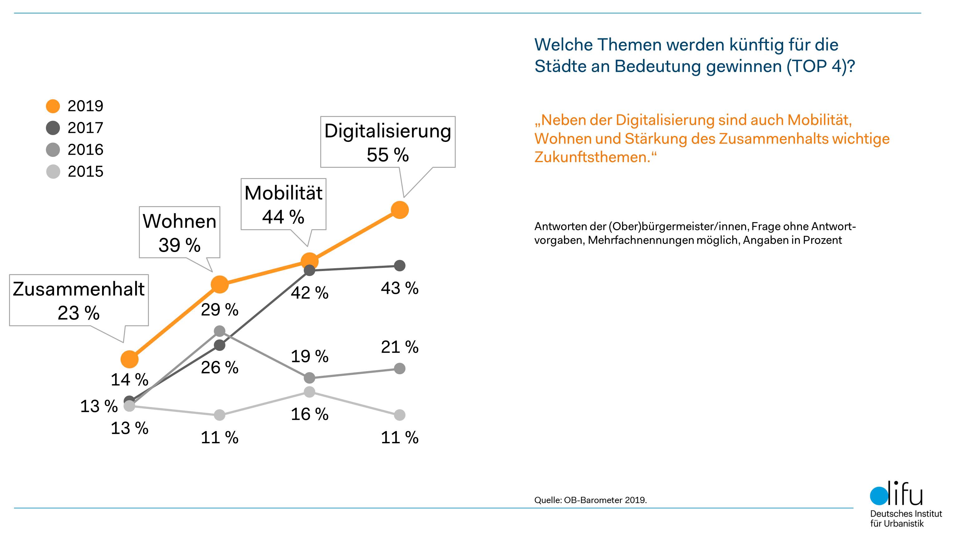 Als wichtigstes Thema für die Zukunft nennen die befragten Oberbürgermeisterinnen und Oberbürgermeister Digitalisierung, zu der auch Aspekte wie Breitbandausbau, E-Government und Smart City gehören. „Die Stadtspitzen wissen, dass die Digitalisierung zunehmend alle Lebensbereiche und damit auch kommunale Aufgabenfelder durchdringt. Damit ist die Herausforderung verbunden, die neuen IT-Technologien aktiv zur Gestaltung lebenswerter und nachhaltiger Städte einzusetzen.“, so Difu-Geschäftsführer Dr. Busso Grabow.