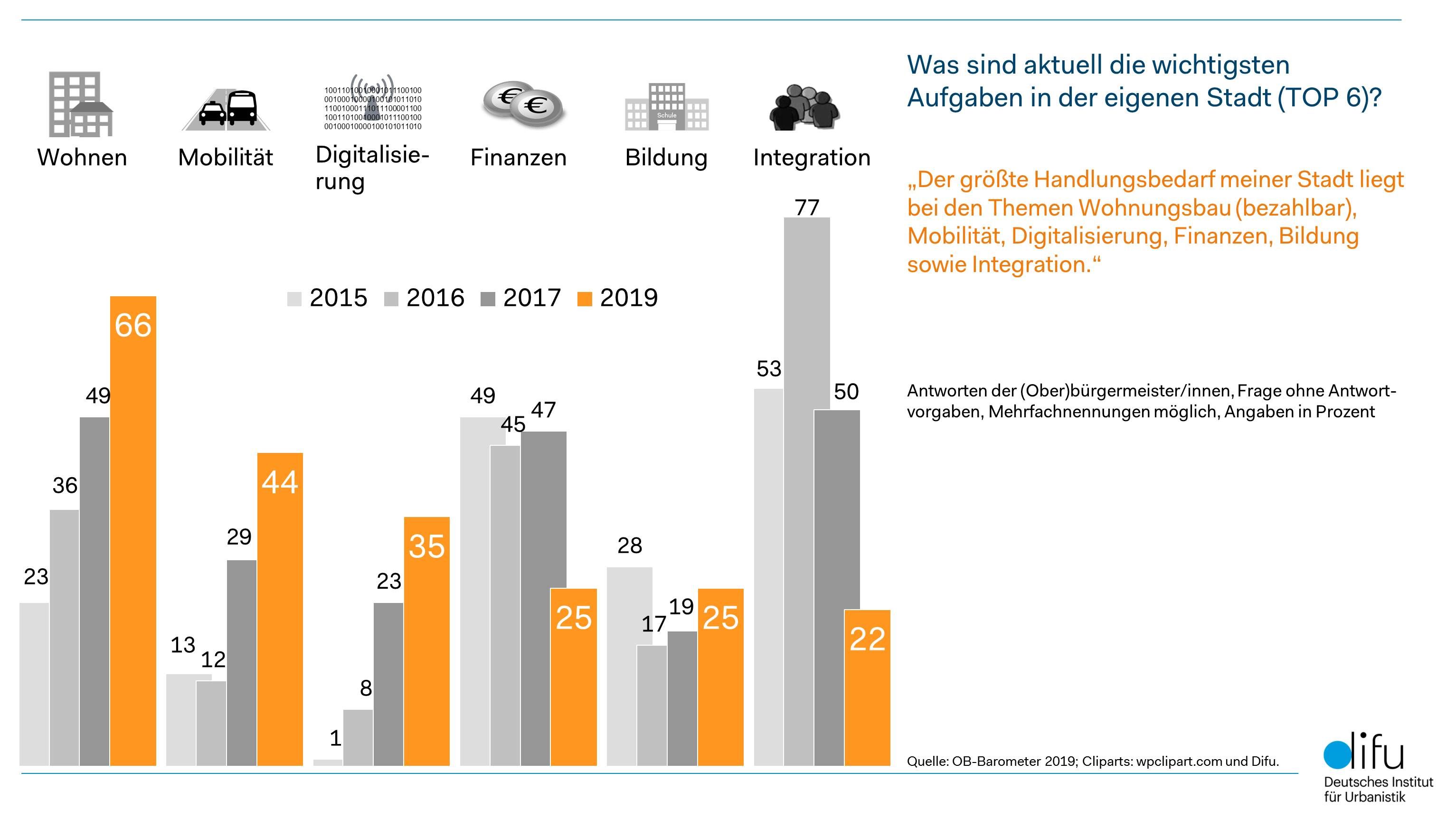 „OB-Barometer 2019“ des Deutschen Instituts für Urbanistik zeigt gegenüber dem Vorjahr deutliche Trendverschiebungen in kommunalen Handlungsfeldern