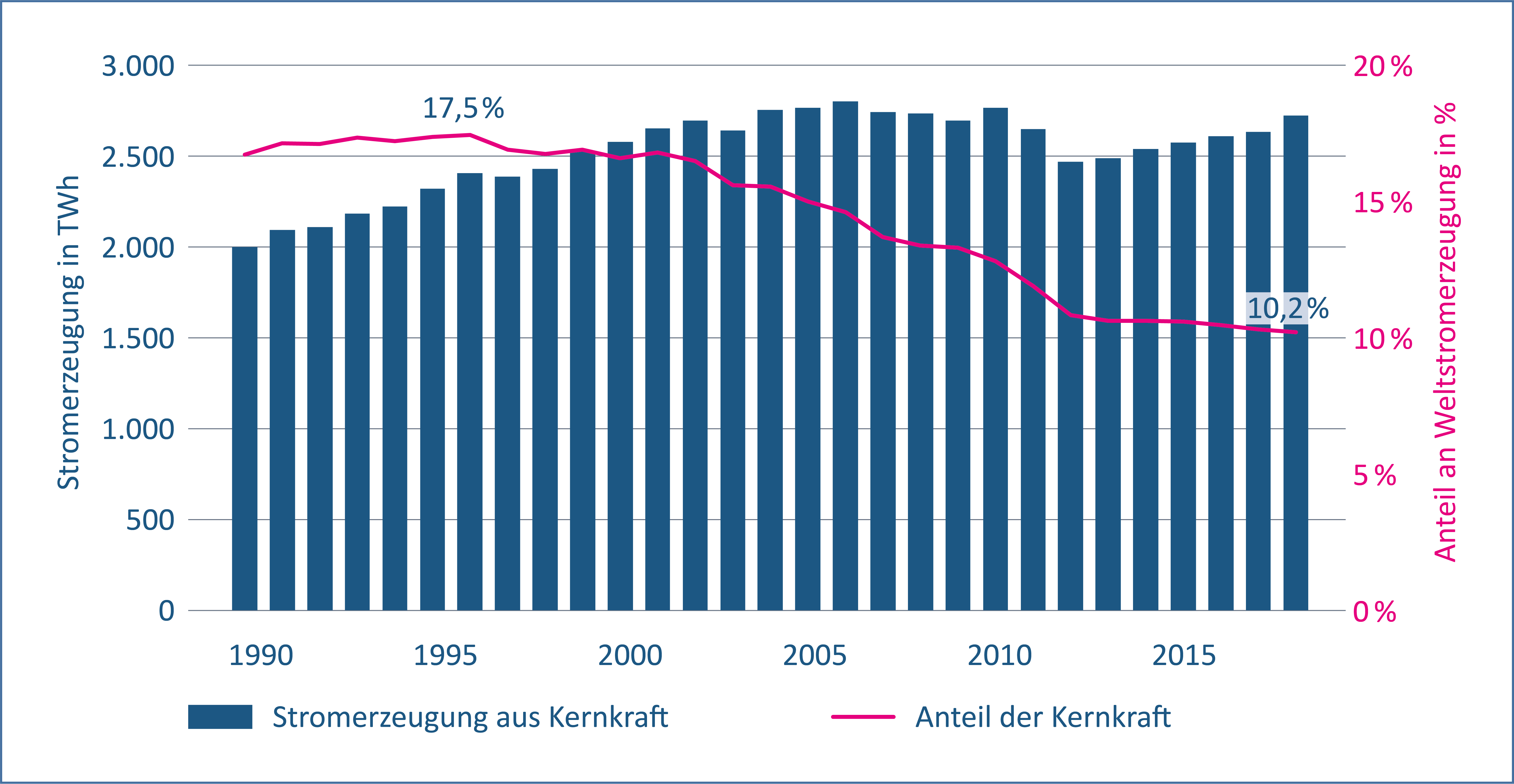 Während Deutschland konsequent aus der Kernenergie aussteigt, bauen andere Länder die Atomkraft weiter aus: 55 Reaktoren werden weltweit neu errichtet. Derzeit produzieren die USA und Frankreich zusammen fast die Hälfte des globalen Atomstroms, Frankreich allein die Hälfte des europäischen. Auch in Zukunft wird Atomstrom fester Bestandteil der französischen Energieversorgung bleiben. In China wächst die Stromerzeugung aus Kernenergie weltweit am stärksten – die Regierung baut elf neue Reaktoren. Russland baut die Kernkraft ebenfalls aus und Japan hat nach der Katastrophe von Fukushima mittlerweile neun Reaktoren wieder in Betrieb genommen. Obwohl Strom aus Kernkraftwerken sehr CO2-arm ist, integrieren nur wenige Staaten Kernenergie in ihre Selbstverpflichtungen zum Klimaschutz. Stattdessen will die überwiegende Mehrheit der Länder ihre Klimaziele mit dem Ausbau erneuerbarer Energien erreichen.