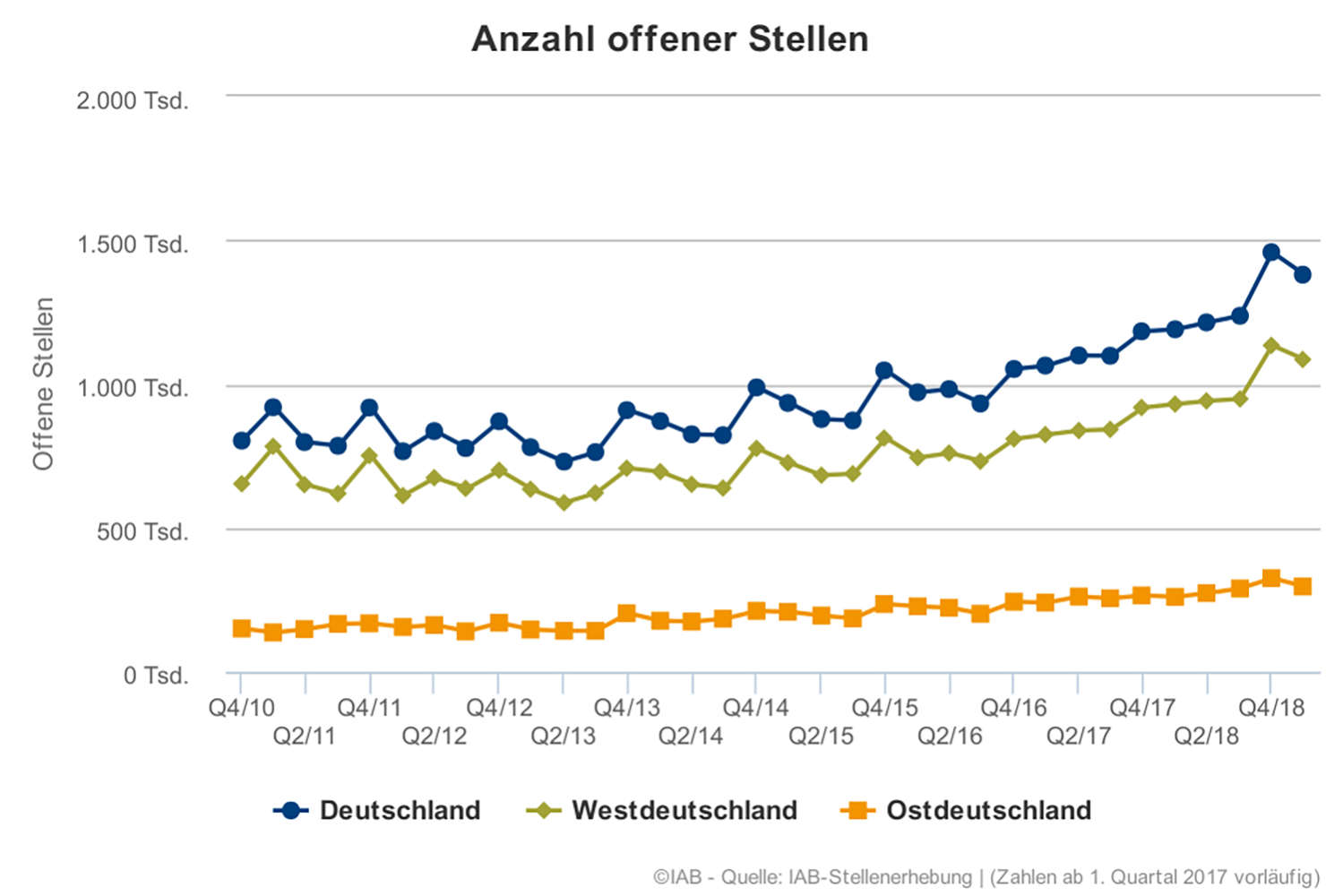 In Westdeutschland waren im ersten Quartal 2019 rund 1.085.000 offene Stellen zu vergeben, in Ostdeutschland rund 296.000.