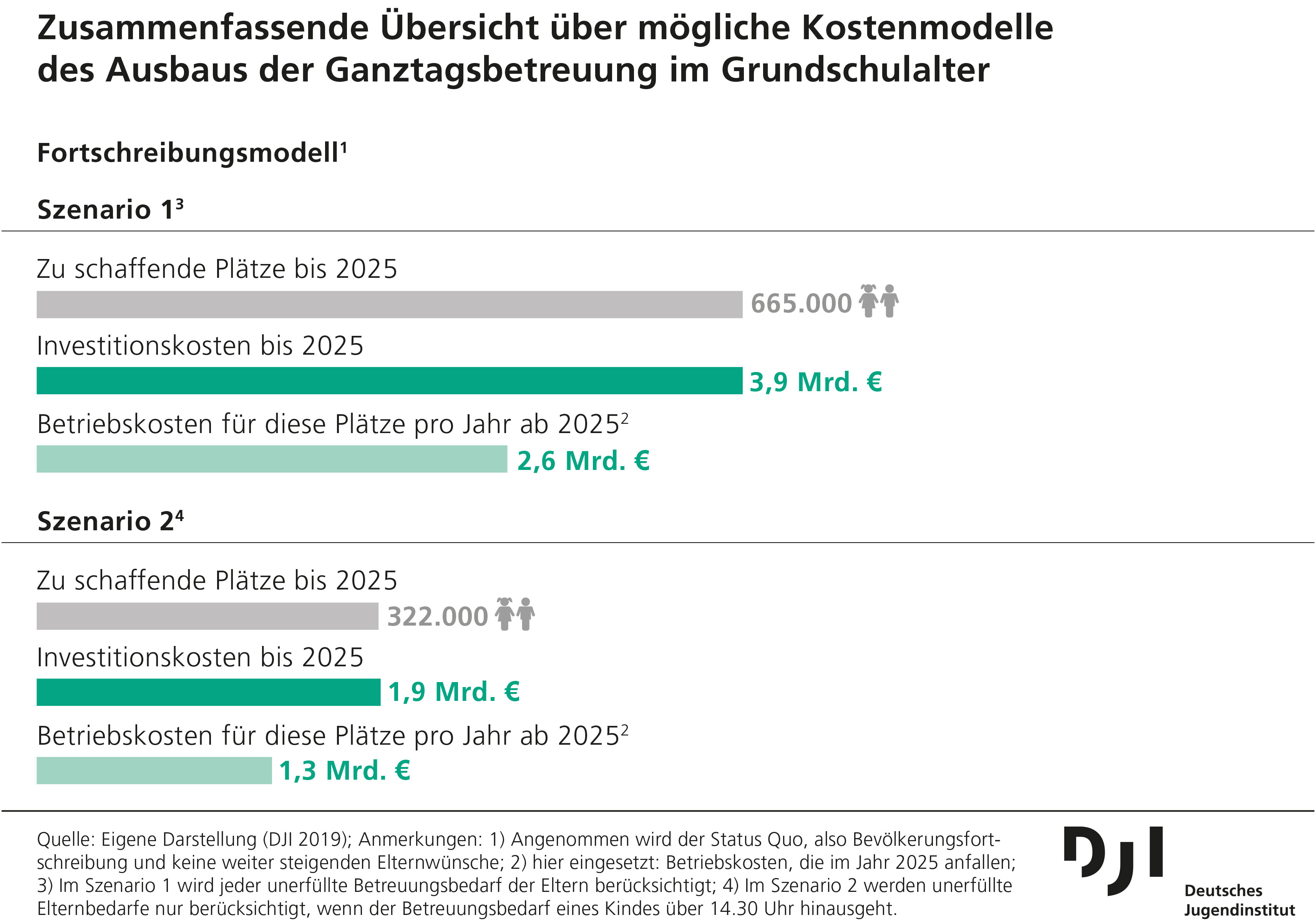 Das Deutsche Jugendinstitut hat differenzierte Analysen des Bedarfs an Ganztagsplätzen in zwei Szenarien ermittelt. In den Berechnungen wird dabei eine Fortschreibung von Bedarf und Kosten, ausgehend vom Status Quo und einer linearen jährlichen Steigerung des Angebots an Ganztagsplätzen angenommen. Wenn alle aktuellen Elternwünsche in Deutschland durch ein entsprechendes Angebot abgedeckt werden sollen, wären das 665.000 zusätzliche Plätze. Für die Schaffung dieser Betreuungsplätze bis zum Jahr 2025 würden insgesamt Investitionskosten in Höhe von etwa 3,9 Milliarden Euro anfallen. Das entspricht einer Größenordnung von ca. 656 Millionen Euro pro Jahr (siehe Abbildung Szenario 1).