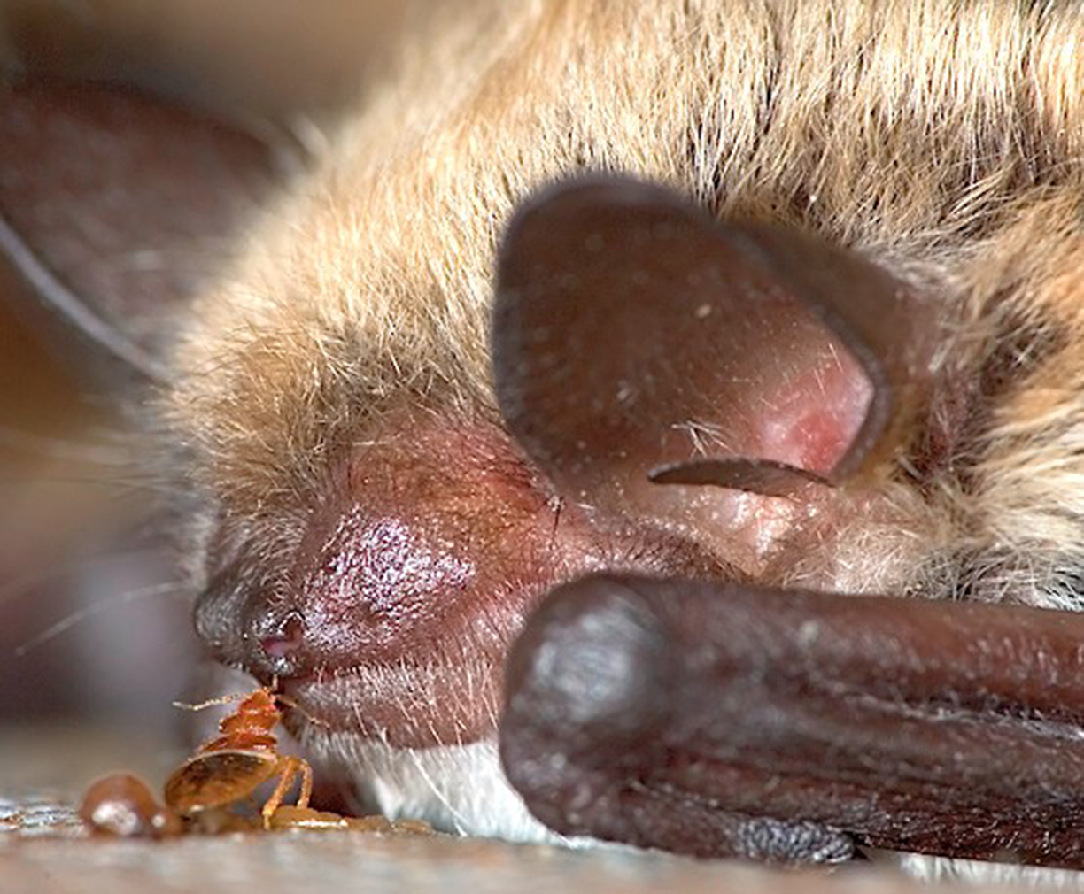Bildunterschrift: Die meisten Bettwanzenarten nutzen Fledermäuse als ihre Wirte. Hier ist eine nordamerikanische Art zu sehen, die Blut aus der Nase einer Fledermaus saugt. Entgegen bisheriger Annahmen, konnten Klaus Reinhardt und sein Team nun beweisen, dass Fledermäuse nicht die ersten Wirte der kleinen Blutsauger waren.