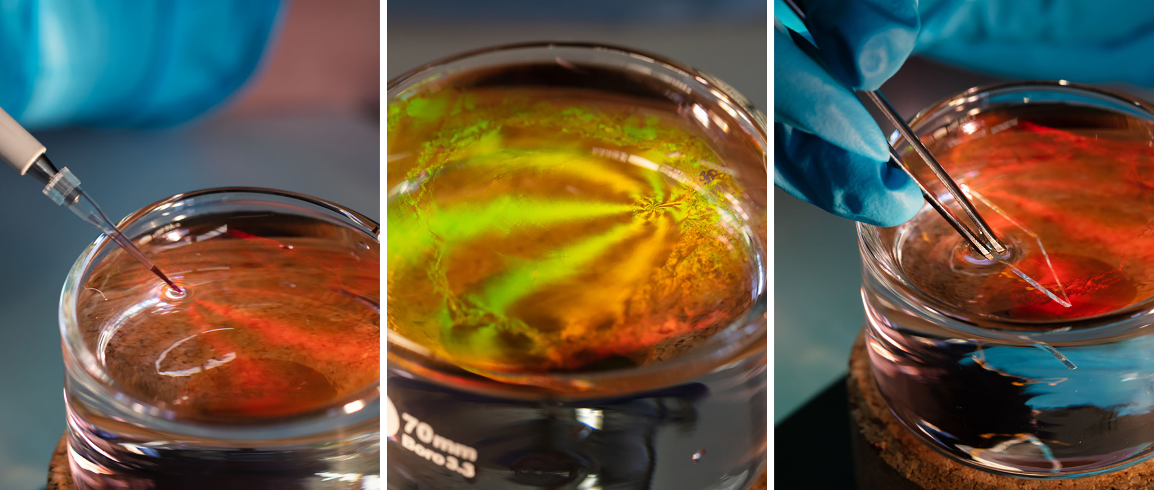 Aus einer verdünnten Lösung dieser Hydrogelkügelchen können die Düsseldorfer dann dünne Schichten herstellen. Sie geben die Kügelchen auf eine Wasseroberfläche, an der sich von alleine eine hochgeordnete und bunt schillernde Schicht ausbildet. Diese Schicht heben sie mithilfe von Glasträgern von der Wasseroberfläche ab. Durch diesen Übertrag auf das Glas schillert nun der gesamte Glasträgern.