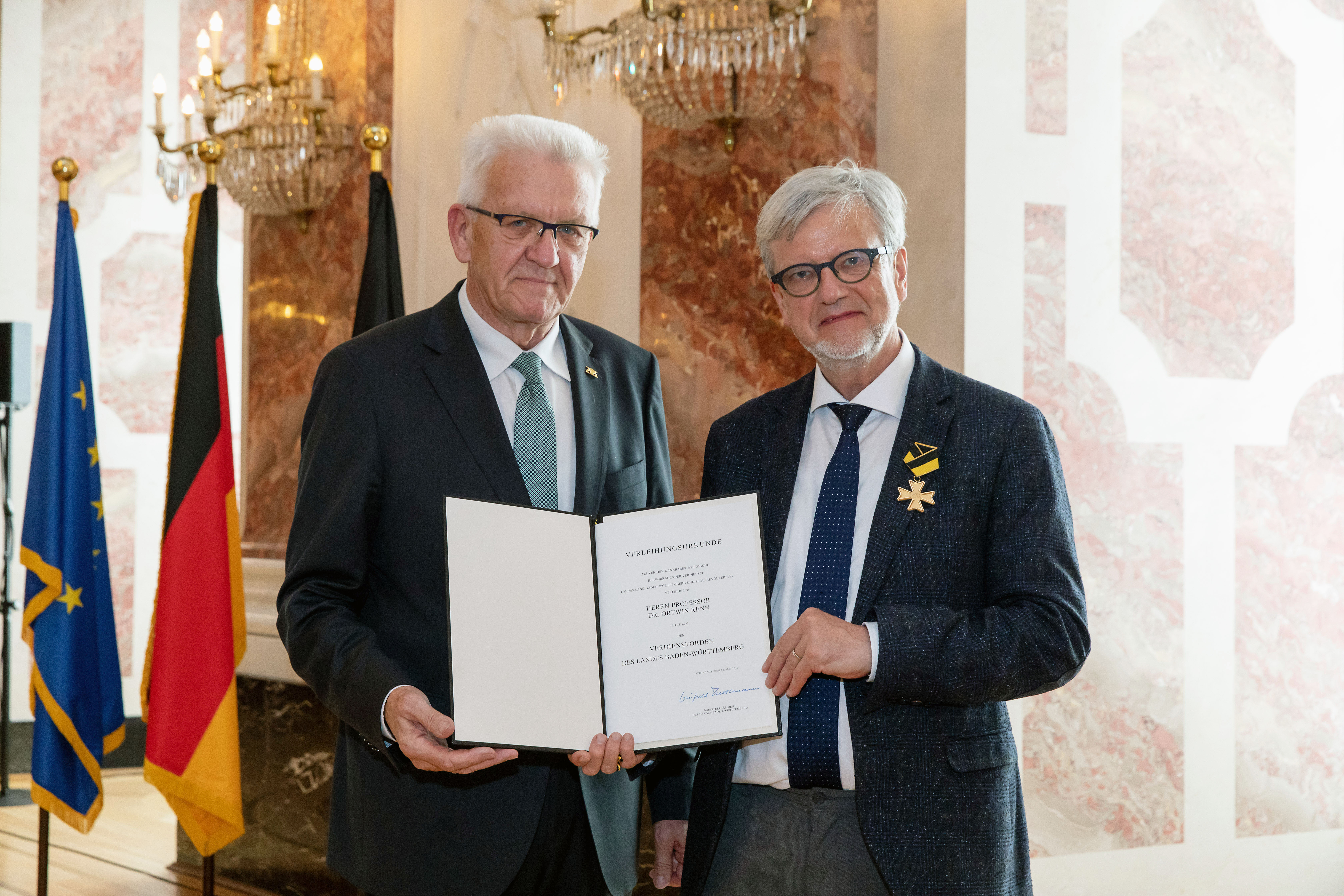 Der baden-württembergische Ministerpräsident Winfried Kretschmann hat 18 Persönlichkeiten mit dem Verdienstorden seines Bundeslandes ausgezeichnet. Unter den Geehrten ist auch Professor Ortwin Renn, wissenschaftlicher Direktor am Institut für transformative Nachhaltigkeitsforschung (IASS). Besonders hervorzuheben seien seine Verdienste in der Umsetzung wissenschaftlicher Erkenntnisse in Politik, Verwaltung und Management. Er habe zudem immer eine nachhaltige und gerechte Wirtschafts- und Gesellschaftsordnung im Blick.