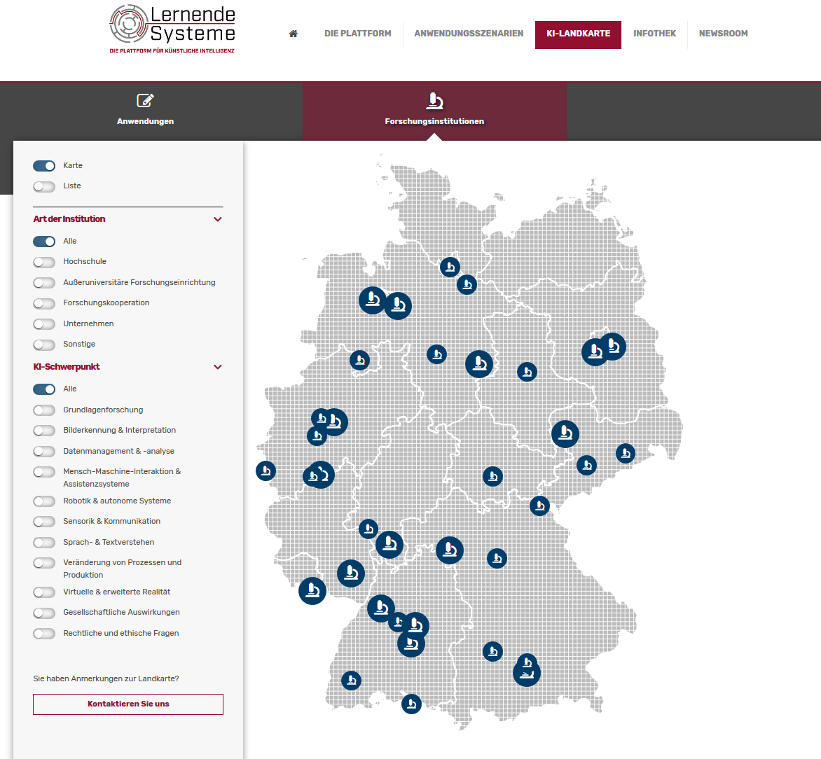 Wo wird in Deutschland zu Grundlagen und Anwendungen der Künstlichen Intelligenz geforscht? Welche Forschungseinrichtungen beschäftigen sich mit Bilderkennung, Datenmanagement und -analyse, Mensch-Maschine-Interaktion, Sprach- und Textverstehen oder Robotik? Die KI-Landkarte der Plattform Lernende Systeme gibt hierzu mithilfe thematischer Filterfunktionen einen umfassenden Überblick. Neben verschiedenen technologischen Schwerpunkten der KI erfasst sie auch Institutionen, die zu gesellschaftlichen Fragen rund um die Entwicklung und den Einsatz von Künstlicher Intelligenz forschen.