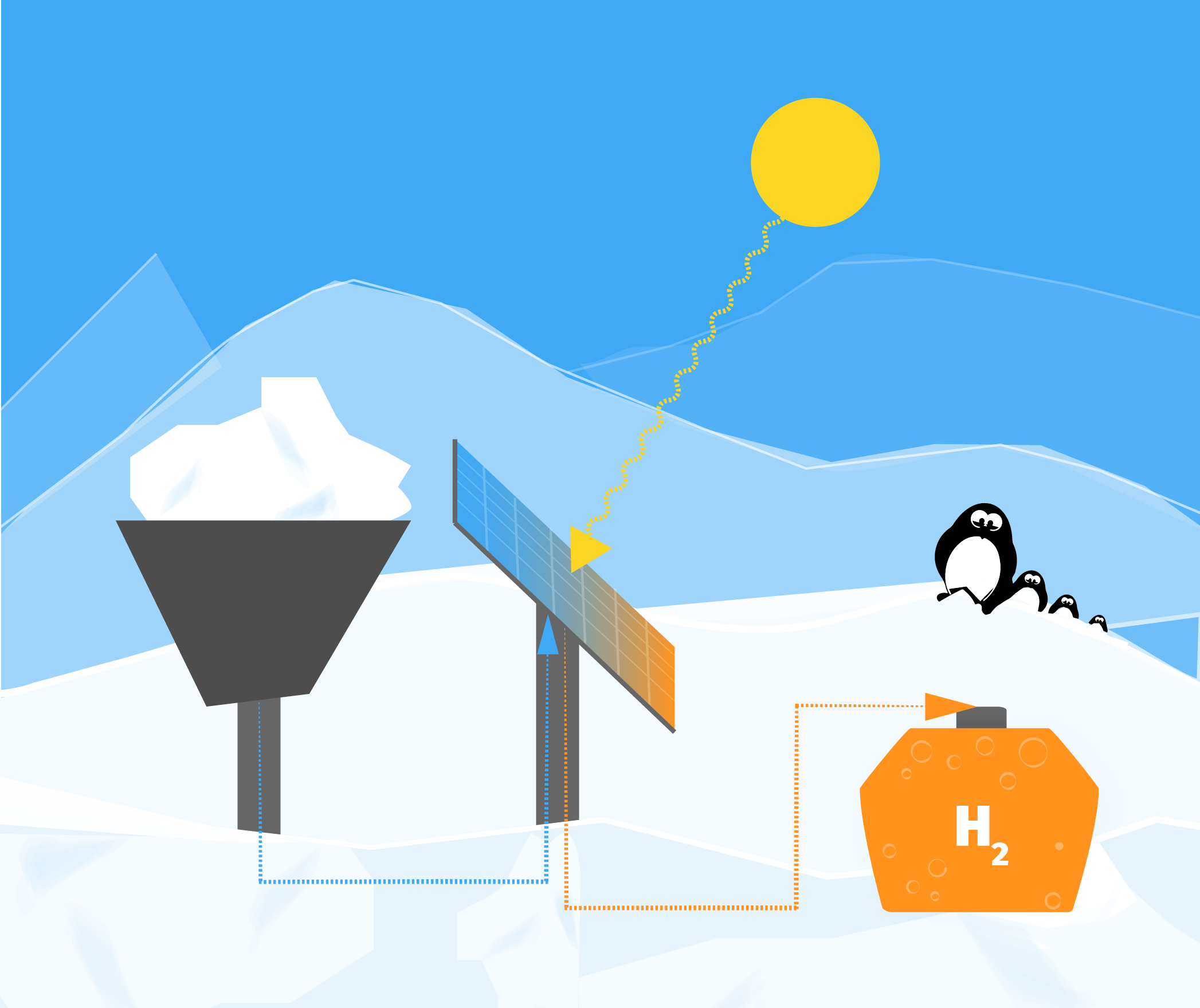 Gleichzeitig scheint während der Sommermonate die Sonne in der Antarktis rund um die Uhr und sehr intensiv. Wäre es nicht möglich, diese Sonnenenergie in eine Energieform umzuwandeln, die sich gut speichern lässt? Diese Idee spielte Kira Rehfeld nach ihrer Heimkehr zusammen mit dem HZB-Experten Dr. Matthias May durch. May forscht an komplexen Materialsystemen, die mit Sonnenlicht Wasser in Sauerstoff und Wasserstoff aufspalten. Wasserstoff speichert die Energie des Lichts als chemische Energie. Bei Bedarf kann diese chemische Energie wiederum in elektrische Energie (Strom) oder Wärme umgewandelt werden, wobei nur Wasser entsteht und keine schädlichen Emissionen.