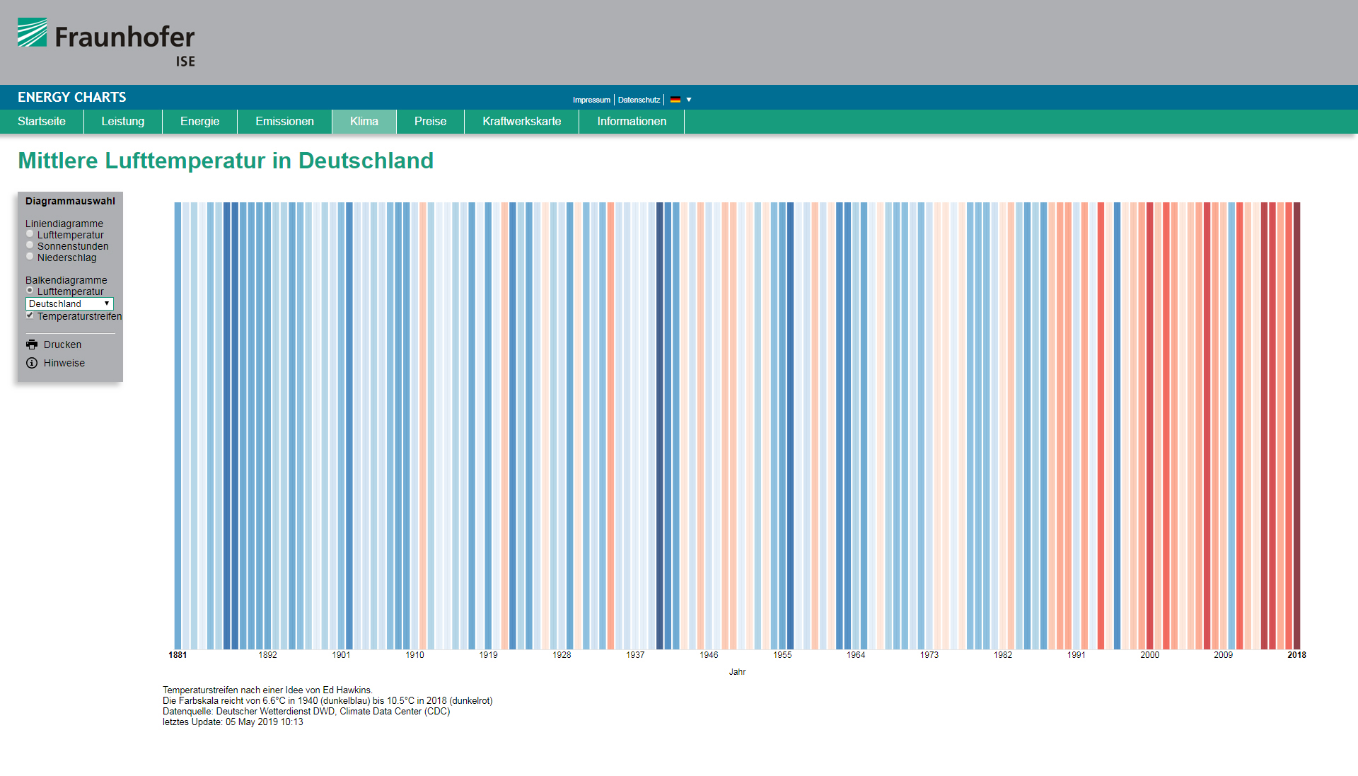 Neu wurden Daten zu Wind, Solarstrahlung, Lufttemperatur und -feuchte von 500 Stationen des Deutschen Wetterdienstes integriert. Das Fraunhofer ISE griff für die Temperaturdarstellung die Idee der „Warming stripes“ des Klimaforschers Ed Hawkins auf, der die Jahresdurchschnittstemperaturen in farbige Strichcodes umgewandelt hatte. Auch der Schadstoffausstoß der Braun- und Steinkohlekraftwerke wird nun angezeigt: Sowohl Treibhausgase als auch Schwermetalle, zum Beispiel Arsen, Nickel und Quecksilber, und andere Stoffe wie Benzol, Feinstaub und Schwefeloxide können abgerufen werden. Begleitet wurde die Erweiterung der Datenplattform auch von Bildungsangeboten für Journalisten und andere Interessenten. Besonders im Kontext der Debatte um den Kohleausstieg und den Hitzesommer 2018 wurde, so Burger, die Datenplattform www.energy-charts.de von Journalisten genutzt, um aktuelle, transparente Zahlen zu recherchieren.