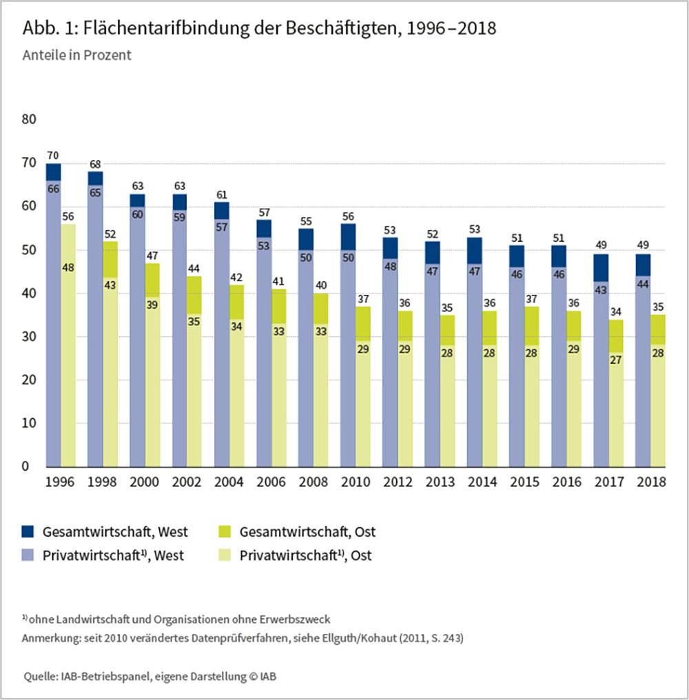 Im Jahr 2018 arbeiteten 46 Prozent der Beschäftigten in Betrieben mit Branchentarifvertrag. Die Tarifabdeckung ist dabei im Westen deutlich höher als im Osten. Rund 49 Prozent der westdeutschen und etwa 35 Prozent der ostdeutschen Beschäftigten arbeiteten in einem Betrieb, in dem ein Branchentarifvertrag galt. Das zeigen Daten des IAB-Betriebspanels, einer jährlichen Befragung von rund 15.000 Betrieben durch das Institut für Arbeitsmarkt- und Berufsforschung (IAB).