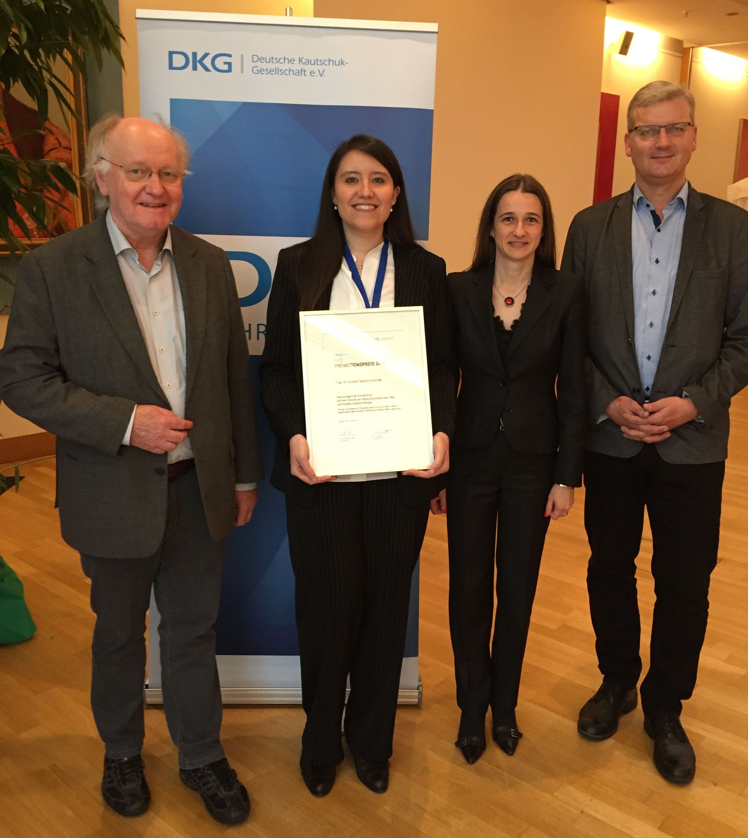 Der Promotionspreis der Deutschen Kautschuk-Gesellschaft e. V. wurde am 21. Mai 2019 an Frau Dr. Beatriz Basterra Beroiz verliehen. Die ausgezeichnete Dissertation „Correlation of Elastomer Structures and Stress-Strain Amplification Mechanisms in Reinforced Rubber Nanocomposites“ entstand im Rahmen einer vom Luxembourg National Research Fund (FNR) geförderten Public-Private-Partnerschaft zwischen der Reifenfirma Goodyear, dem Leibniz-Institut für Polymerforschung Dresden e. V. (IPF), der Technischen Universität Dresden (TUD) und dem Instituto de Ciencia y Tecnología de Polímeros des CSIC in Madrid, Spanien.