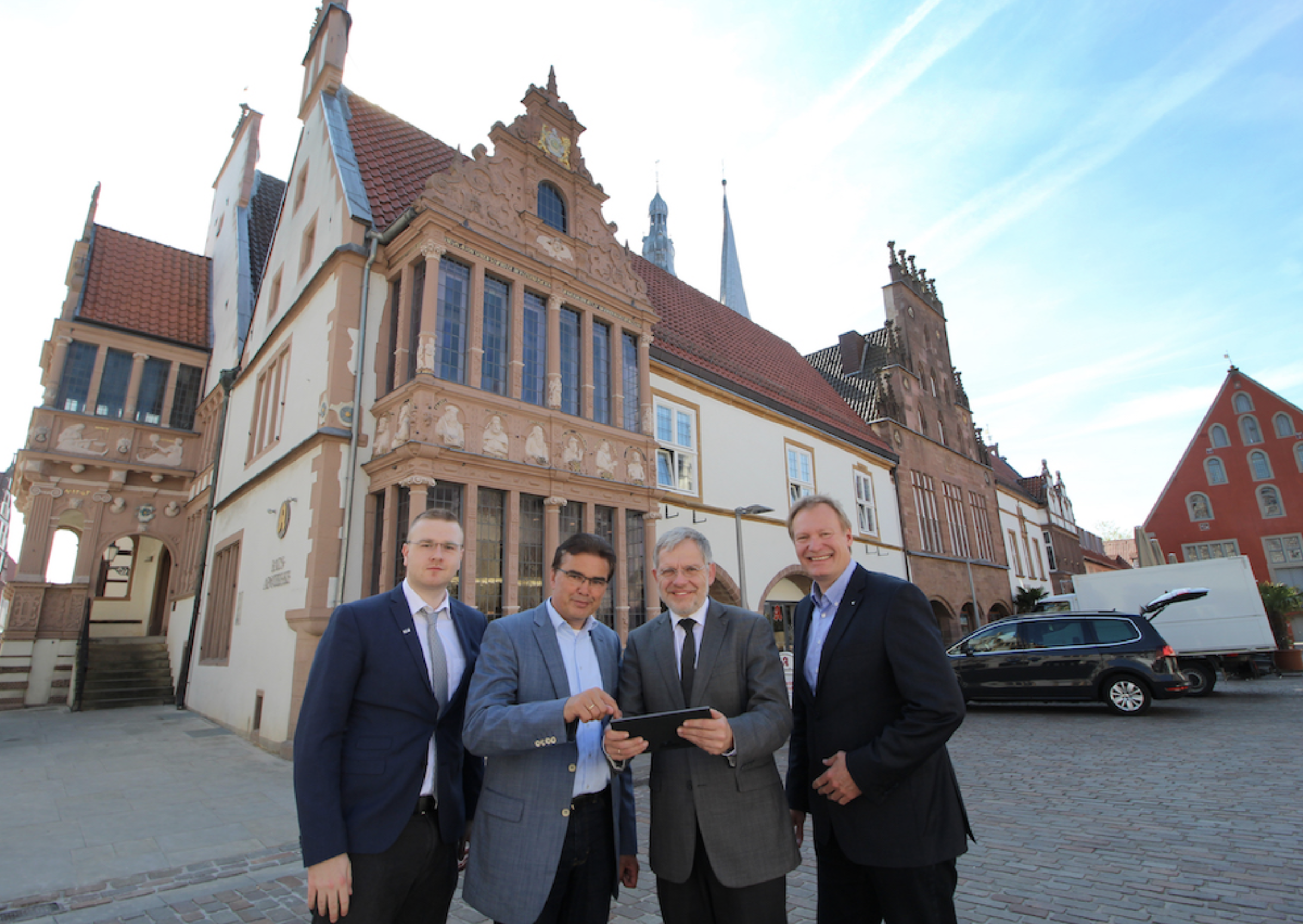 „Daten sind das neue Gold“, so die oft zitierte Losung im Zuge der Digitalisierug von Unternehmen und Städten. Und im Fall von Städten sind Daten eine wichtige Grundlage für funktionierende Smart-City Konzepte. Denn eines ist klar: Die digitale Transformation lebt von Daten und von Menschen, die ihnen Bedeutung geben bzw. sie interpretieren können. Vor diesem Hintergrund haben Forscherinnen und Forscher vom Fraunhofer IOSB-INA und vom Institut für industrielle Informationstechnik (inIT) der Technischen Hochschule OWL den im Rahmen des Reallabors Lemgo Digital erhobenen Daten nun ein Gesicht gegeben. Das neue Dashboard führt unterschiedliche städtische Datenströme zusammen und bildet diese in Echtzeit ab. Es erlaubt Nutzerinnen und Nutzern, in Teilbereichen des Alltagslebens mitzuverfolgen, wie die Stadt funktioniert und welchen „Pulsschlag“ sie aktuell hat. Dazu gehören in der vorliegenden Version Informationen zum Stadtbus, zum Personenaufkommen und der Parkraumbelegung in der historischen Innenstadt, die alle in Echtzeit und grafisch aufbereitet dargestellt werden. Am Donnerstagvormittag traf eine kleine Delegation um Professor Jürgen Jasperneite, Leiter des Fraunhofer IOSB-INA, im Rathaus der Alten Hansestadt Lemgo mit Bürgermeister Dr. Reiner Austermann zusammen, um die erste Version des City-Cockpits für Lemgo zu überreichen. Austermann hält nun sozusagen das digitale Abbild seiner Stadt in den Händen; dieses ist allerdings nicht nur ihm vorbehalten, denn alle Interessierten erhalten unter der Adresse https://dashboard.lemgo-digital.de/ ebenfalls Zugriff auf das Dashboard. Mit dem Cockpit haben die Forscherinnen und Forscher von Fraunhofer, gemeinsam mit dem Partnerinstitut der Technischen Hochschule OWL, außerdem die Grundlage für weitere künftige Mehrwerte geschaffen: So sollen zum einen weitere Funktionen integriert werden, wie beispielsweise die aktuelle Verkehrslage. Zum anderen soll die zeitliche Entwicklung bestimmter Situationen in der Stadt innerhalb der nächsten Minuten oder Stunden durch den Einsatz von Verfahren der maschinellen Intelligenz prognostizierbar werden. Das Projektteam freut sich über direktes Feedback und Anregungen, sowohl persönlich im Projektbüro in der Mittelstraße, unter der E-Mail-Adresse office@lemgo-digital.de oder unsere Social Media Kanäle bei Facebook und Twitter.