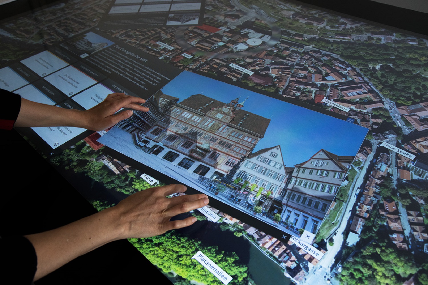 Im 1435 erbauten Tübinger Rathaus wird die Geschichte der Stadt seit Juni 2019 auch digital erzählt. Möglich macht dies eine eigens von IWM-Wissenschaftlerinnen und Wissenschaftlern entwickelte Multimedia-Installation. Der interaktive City-Guide, der ab sofort der Öffentlichkeit im Foyer des Rathauses zur Verfügung steht, baut mit seiner intuitiven Funktionalität Berührungsängste schon mit der ersten Wischgeste ab. Das ist wichtig, da nicht die Hardware, sondern die Vermittlung von Wissen im Mittelpunkt steht.