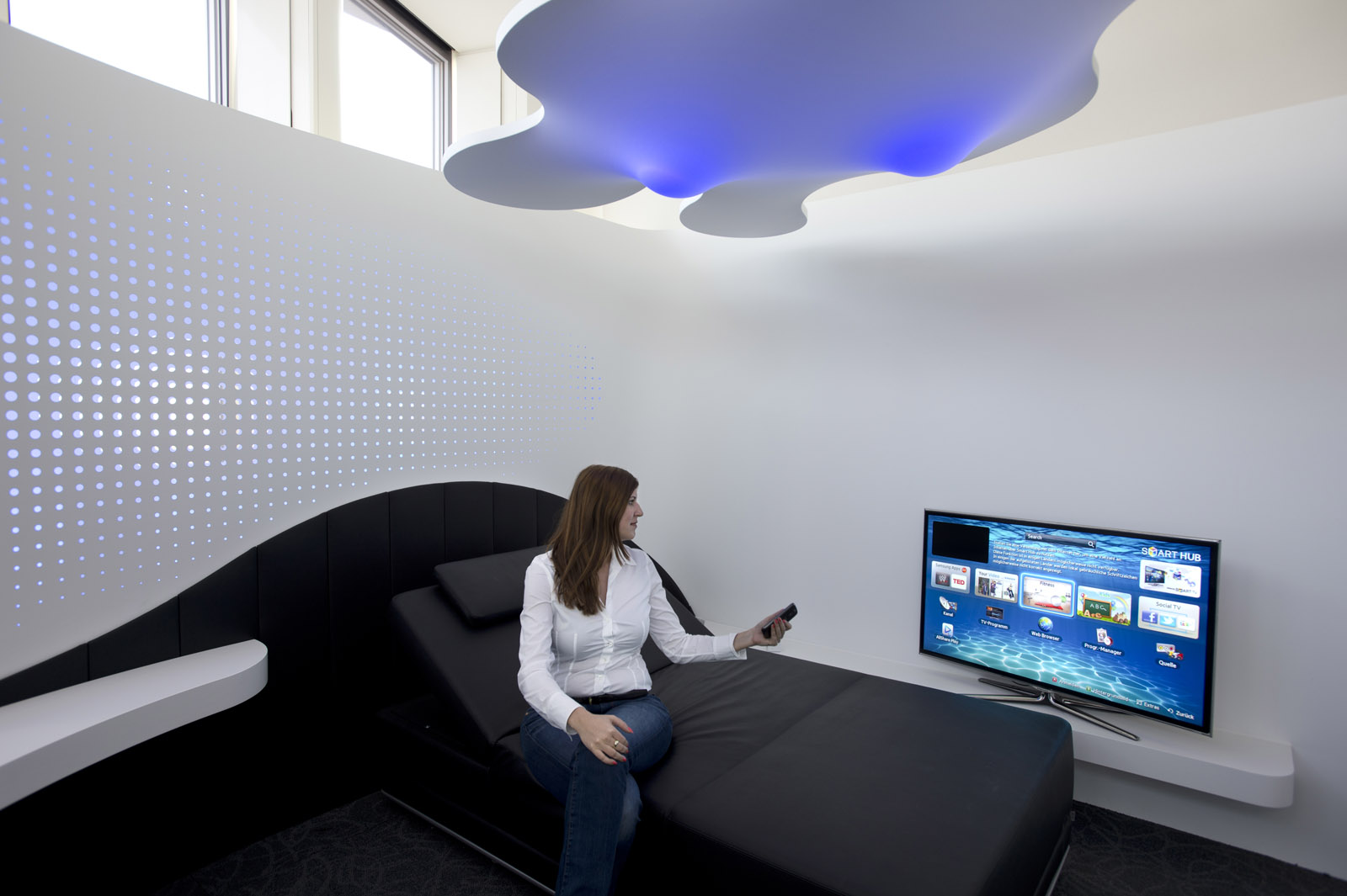 Welche Schalthebel sorgen also für mehr Erholung und Komfort? Wie lassen sich positive Gefühle beim Gast wecken und ihn bewegen, wiederzukehren? Wie können Licht, Temperatur und Hintergrundmusik genutzt werden, um das Stressempfinden des Gastes zu regulieren? Maßgeblich für gute Erholung ist der Schlafkomfort, so eines der Ergebnisse des Forschungsprojekts. Technisch hochgerüstetete Hotelbetten sind beispielsweise mit Matrazen unterschiedlicher Härtegrade, Massagefunktionen und Temperaturreglern ausgestattet, und lassen sich auf die Bedürfnisse des Gastes individuell einstellen. Ein weiterer wichtiger Einflussfaktor für die Erholung ist das Hotelzimmer, das sauber und behaglich sein muss. Erwartet werden eine gute Internetverbindung und ausreichend Steckdosen. Über Steuerungstechnologien wird sich der Raum künftig an seinen Gast persönlich anpassen und mit dessen Mobilgeräten wie Smartphone oder Wearable kommunizieren können. Zudem wird sich das Zimmer auf Vitalparameter des Gastes wie seinen Blutdruck oder Körpertemperatur einstellen. Auch die Stimmung könnte mit Sensorik ausgelesen und Raumparameter wie Beleuchtung auf den Dienstreisenden adaptiert werden: »Je nach Anforderung bestünde die Möglichkeit, ein anregendes, stimulierendes oder ein konzentrationsförderndes, kaltblaues Licht einzuspielen«, schildert die Architektin einige Optionen der Digitalisierung.